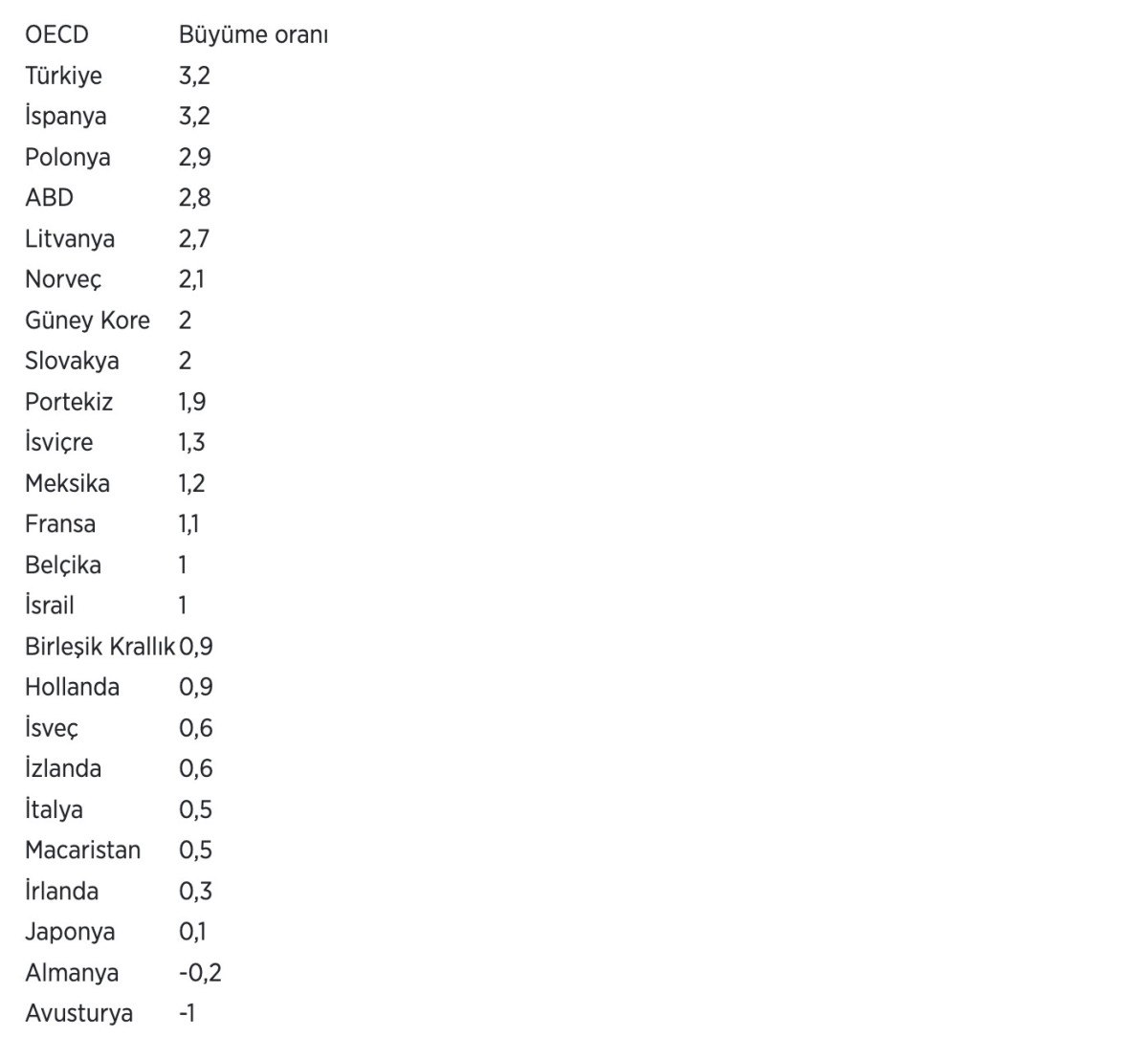 Türkiye ve İspanya’yı, yüzde 2,9’luk büyüme oranıyla Polonya takip etti. Bu ülkeyi yüzde 2,8 ile ABD, yüzde 2,7 ile Litvanya ve yüzde 2,1 ile Norveç izledi.