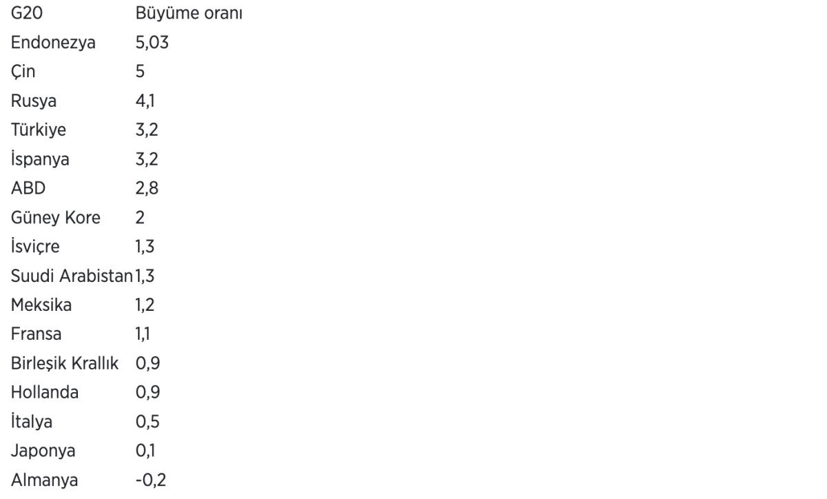 Öte yandan, G20 ülkeleri arasında ekonomisi en hızlı büyüyen ülke, yüzde 5,03 ile Endonezya olurken bu ülkeyi yüzde 5 ile Çin ve yüzde 4,1 ile Rusya izledi.