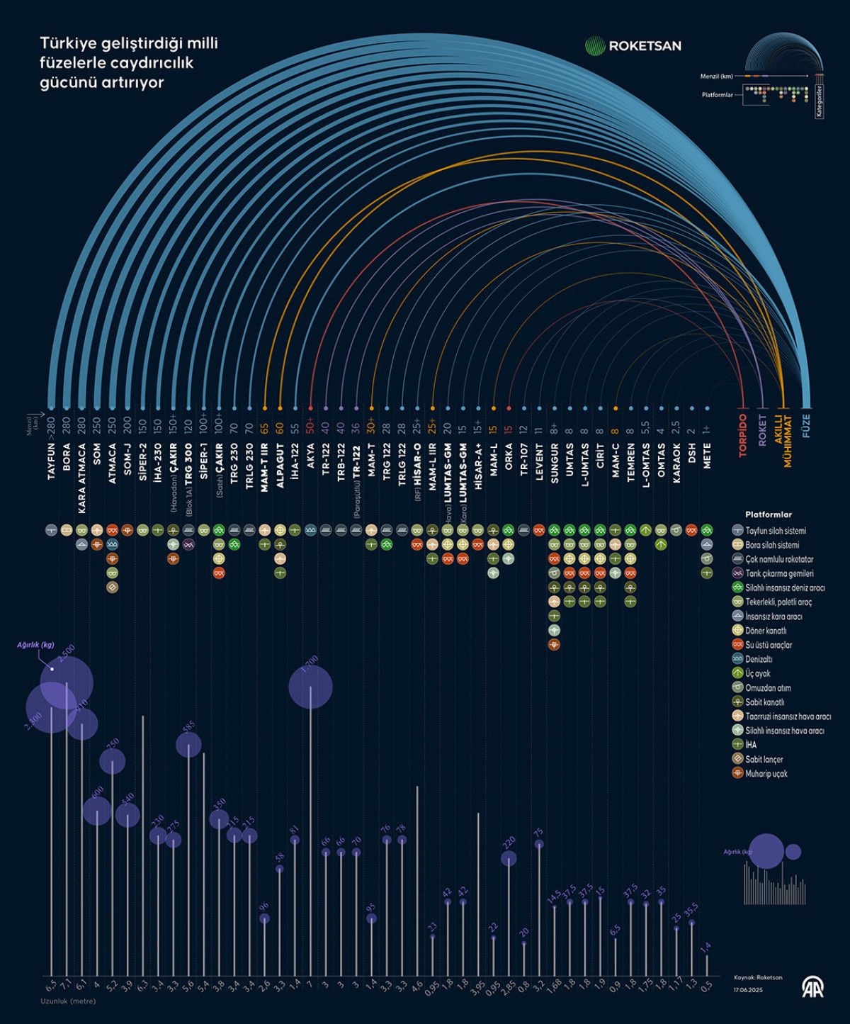 AA muhabirinin derlediği bilgilere nazaran, Savunma Sanayii Başkanlığının (SSB) dayanaklarıyla ROKETSAN tarafından üretilen ulusal füzeler, Türkiye’nin savunmasında kıymetli rol oynuyor. Bu füzeler ortasında öne çıkan kara sistemlerinden TAYFUN füzesi 280+ kilometre menzille vazife yapıyor. TAYFUN, hipersonik düzeylere ulaşan suratı sayesinde hava savunma sistemi tehditlerinden etkilenmiyor. Füze, düşük etraf şartı hassaslığı sayesinde gece ve gündüz olmak üzere her hava şartında misyon yapabiliyor.