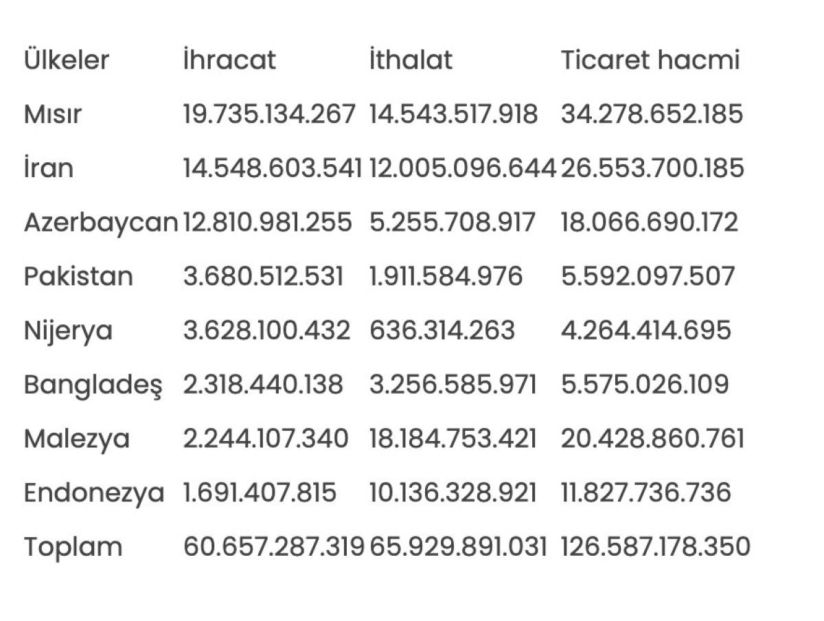 Türkiye, bu periyotta Mısır, İran, Azerbaycan, Pakistan ve Nijerya’yla yaptığı ticarette dış ticaret fazlası verdi. Anılan fazla, Mısır ile ticarette 5,2 milyar dolar, İran ile ticarette 2,5 milyar dolar, Azerbaycan ile ticarette 7,6 milyar dolar, Pakistan ile ticarette 1,8 milyar dolar ve Nijerya ile ticarette yaklaşık 3 milyar dolar olarak hesaplandı.