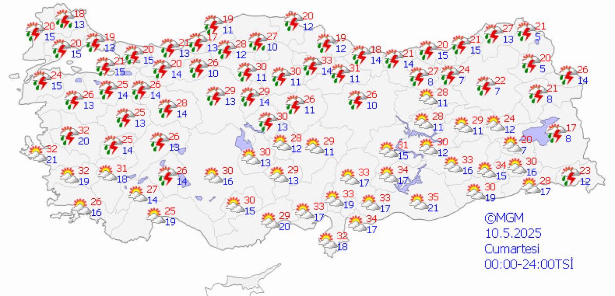 Çelik, cuma günü havanın çoğunlukla kesimli bulutlu geçeceğini ve iç kısımlarda kısa periyodik mahallî yağışlar görülebileceğini lisana getirerek, “Cumartesi günü birinci saatlerden itibaren Marmara’da bölge genelinde gök gürültülü yağışlar göreceğiz. Bu yağışlar yer yer kuvvetli olabilir. Öğlen saatlerine gerçek ise İç Anadolu’nun kuzey ve Batı Karadeniz’de gök gürültülü yağış geçişleri göreceğiz” diye konuştu.