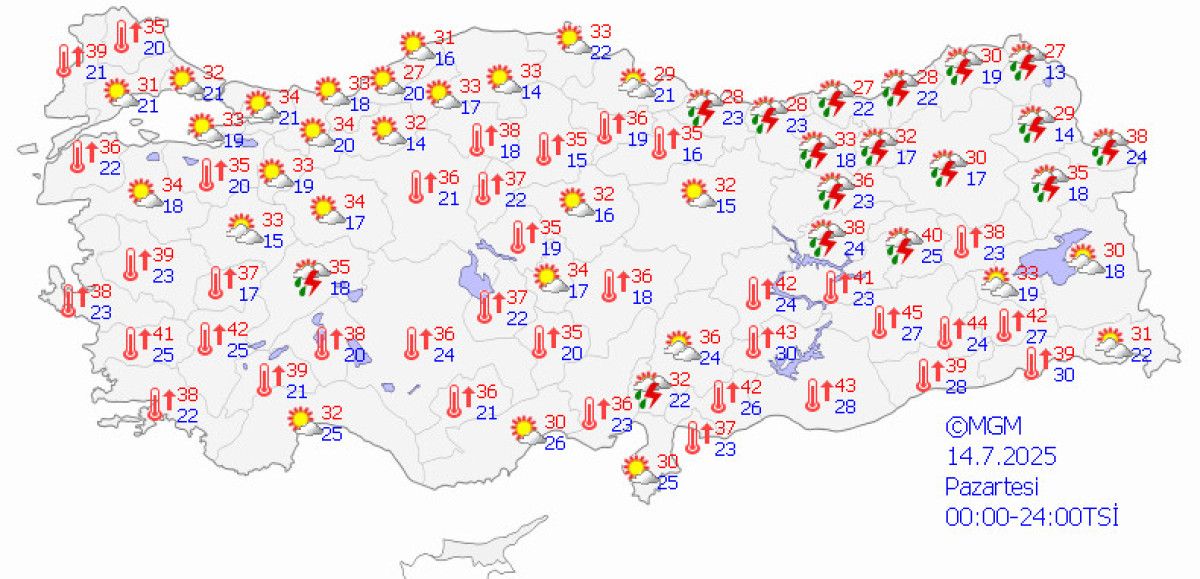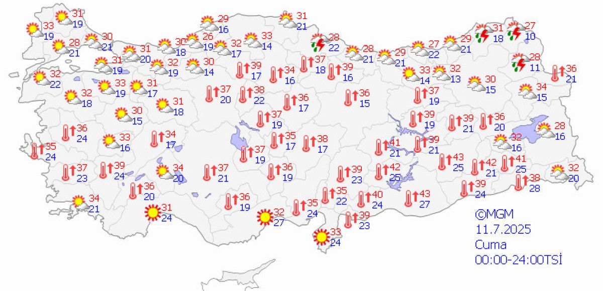 Bugün, 10 Temmuz Perşembe günü, ülke genelinde sıcaklıkların 24 ile 39 ortasında değiştiği görülüyor.