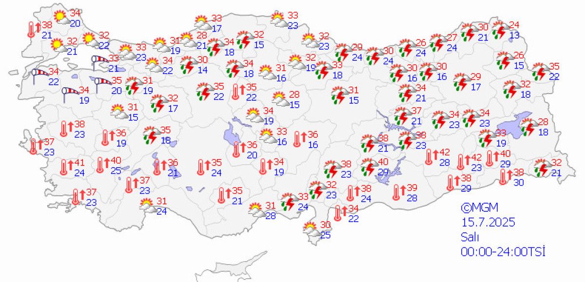 Özellikle Güneydoğu Anadolu Bölgesi’nde termometreler 45 dereceyi aşarken, Doğu Anadolu ve Karadeniz’in kimi kısımlarında mahallî gök gürültülü sağanak yağışlar bekleniyor.