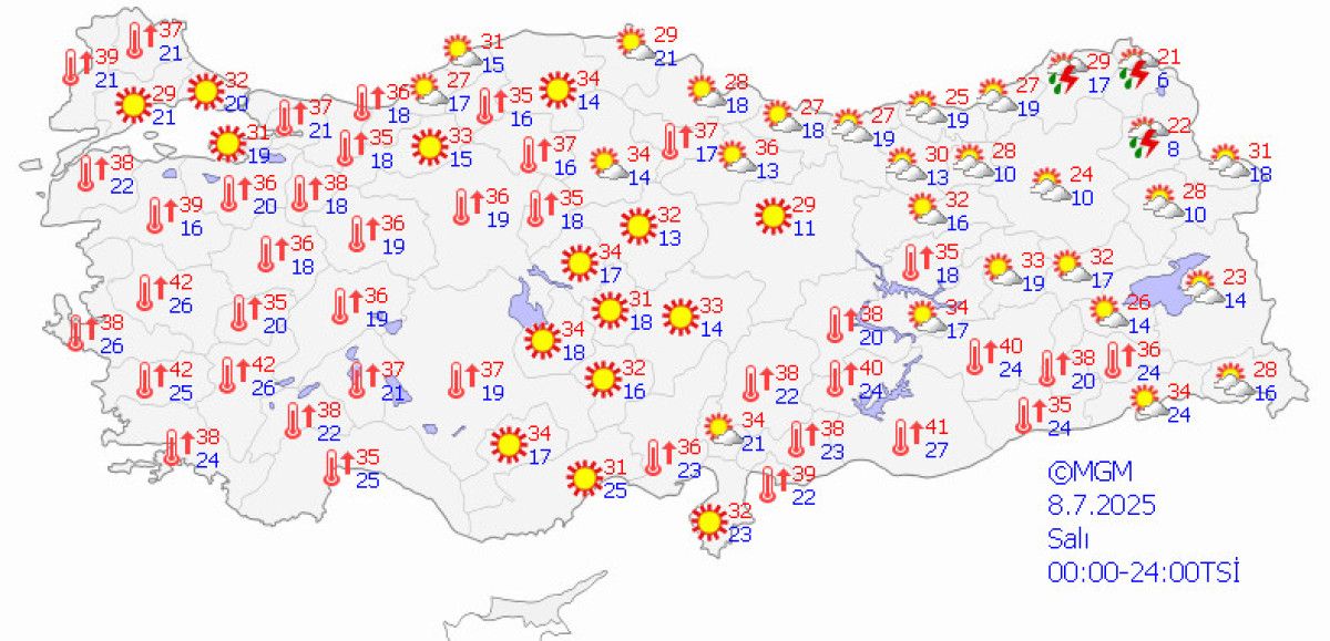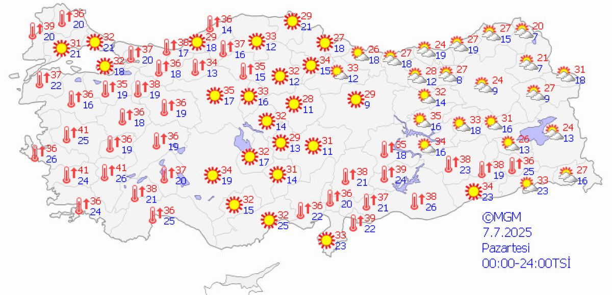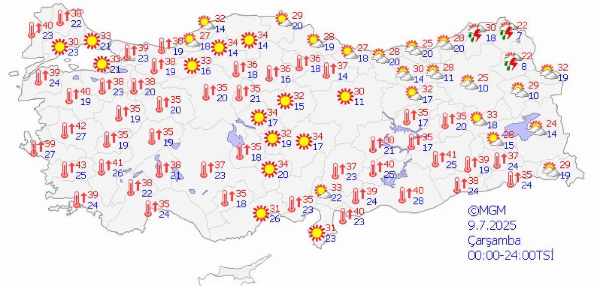 Özellikle batı ve iç kesitlerde termometreler rekor düzeylere ulaşacak. Aydın’da 44 dereceye kadar çıkması beklenen sıcaklıklar; Edirne ve Muğla’da 40, Antalya’da 40, İzmir’de 39, Ankara ve Konya’da 36, İstanbul’da ise 34 dereceye ulaşacak.