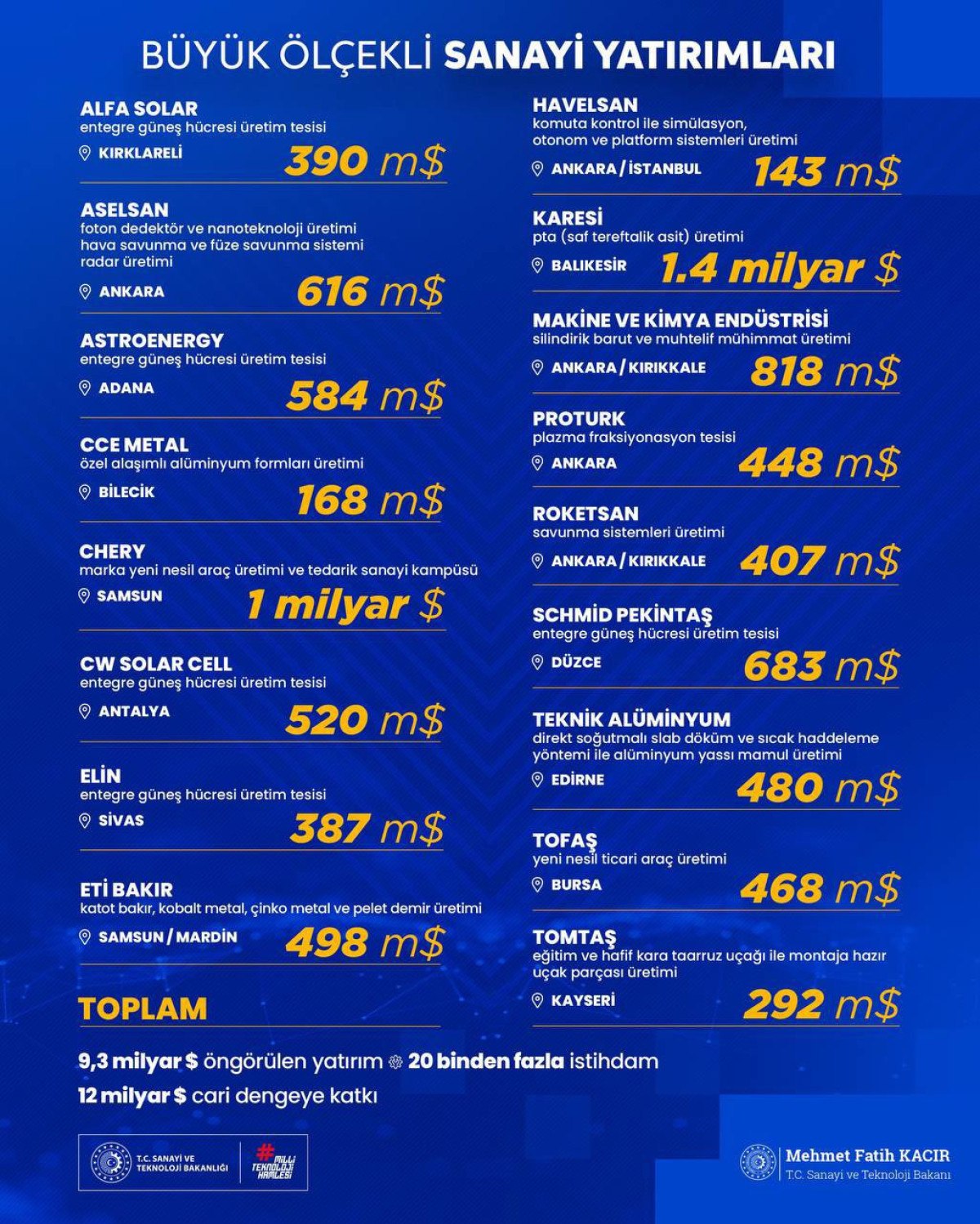 Sanayi ve Teknoloji Bakanı Mehmet Fatih Kacır, Türkiye’ye yapılacak toplam 9,3 milyar dolarlık büyük ölçekli yatırımla cari dengeye yıllık 12 milyar dolar katkı sunulacağını bildirdi.