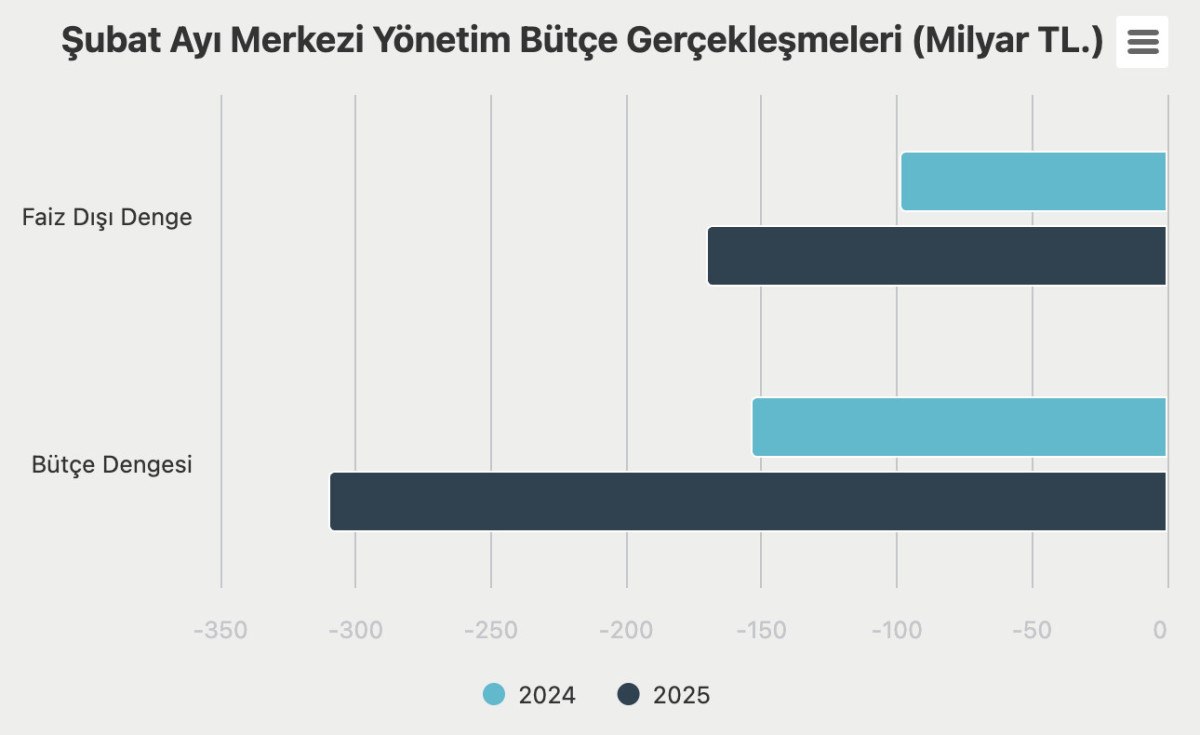 2025 yılı Şubat ayında merkezi yönetim bütçe giderleri 1 trilyon 33,5 milyar TL, bütçe gelirleri 723,4 milyar TL ve bütçe açığı 310,1 milyar TL olarak gerçekleşti.