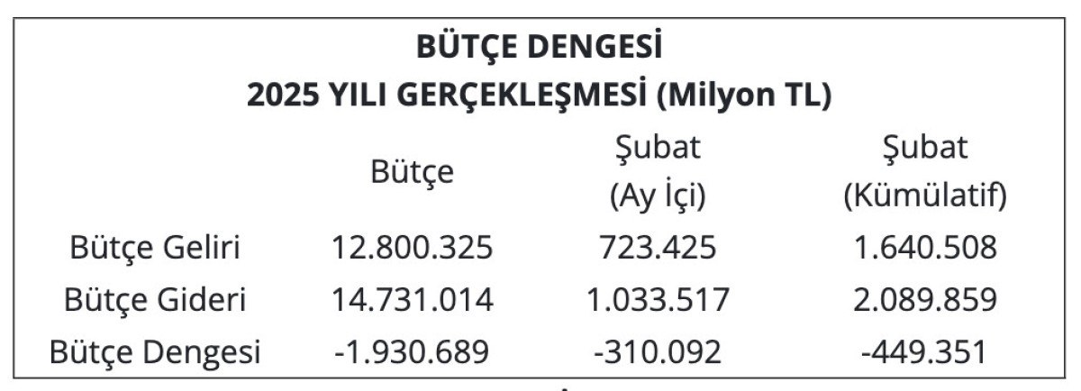 2025 yılı Ocak-Şubat döneminde merkezi yönetim bütçe giderleri 2 trilyon 89,9 milyar TL, bütçe gelirleri 1 trilyon 640,5 milyar TL ve bütçe açığı 449,4 milyar TL olarak gerçekleşti.