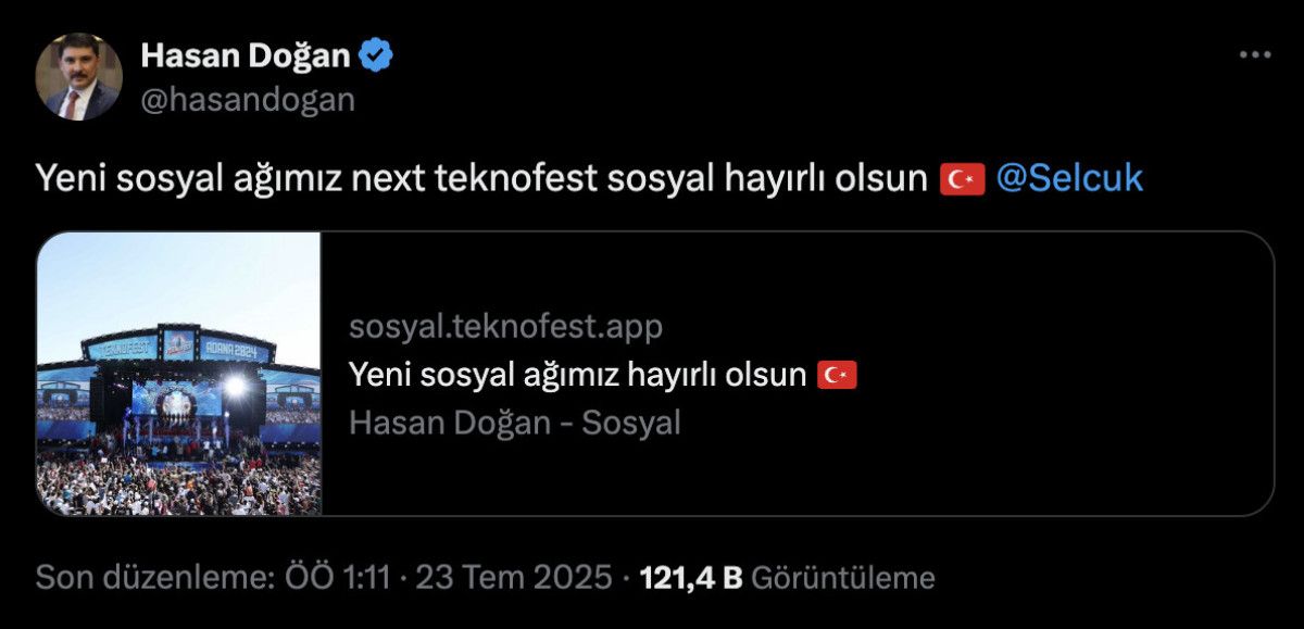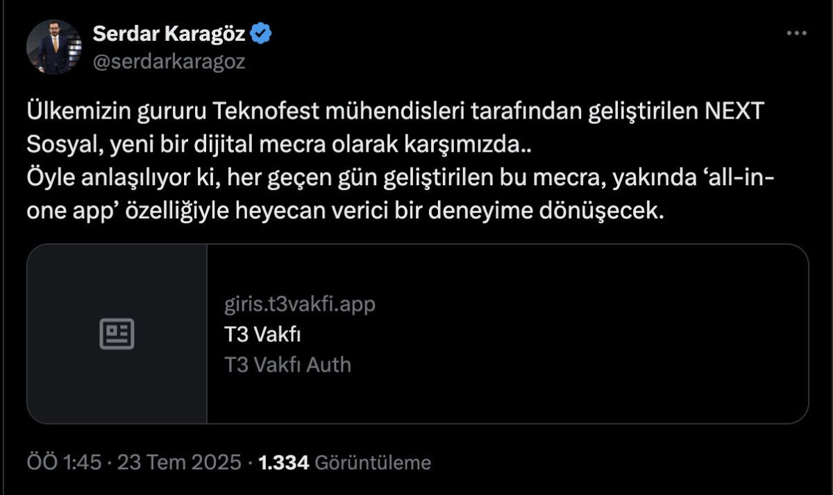 Anadolu Ajansı Genel Müdürü Serdar Karagöz de hesap açtığını, yaptığı X paylaşımı ile duyurdu. Karagöz, “Ülkemizin gururu Teknofest mühendisleri tarafından geliştirilen NEXT Toplumsal, yeni bir dijital mecra olarak karşımızda..
