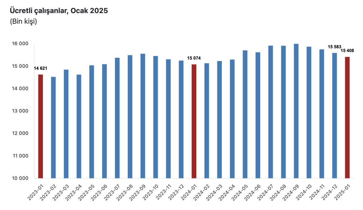 Buna göre, 2024 Ocak’ta 15 milyon 73 bin 564 kişi olan sanayi, inşaat ve ticaret-hizmet sektörleri toplamında ücretli çalışan sayısı, geçen yılın aynı döneminde yüzde 2,2 artışla 15 milyon 407 bin 625 kişiye yükseldi.