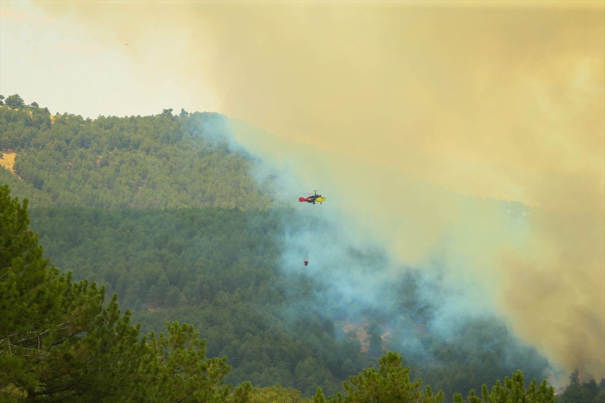 İhbar üzerine bölgeye 2 helikopter ve Orman İşletme Müdürlüğü’ne bağlı çok sayıda arazöz sevk edildi.