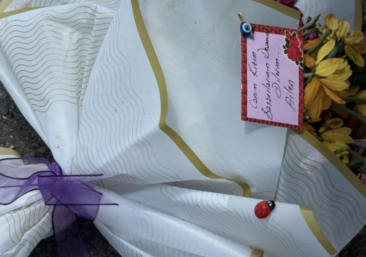 Otomobilde, üzerinde “Canım kızım muvaffakiyetlerinin devamını dilerim. Ailen” yazılı kartın olduğu çiçek, görenleri duygulandırdı.