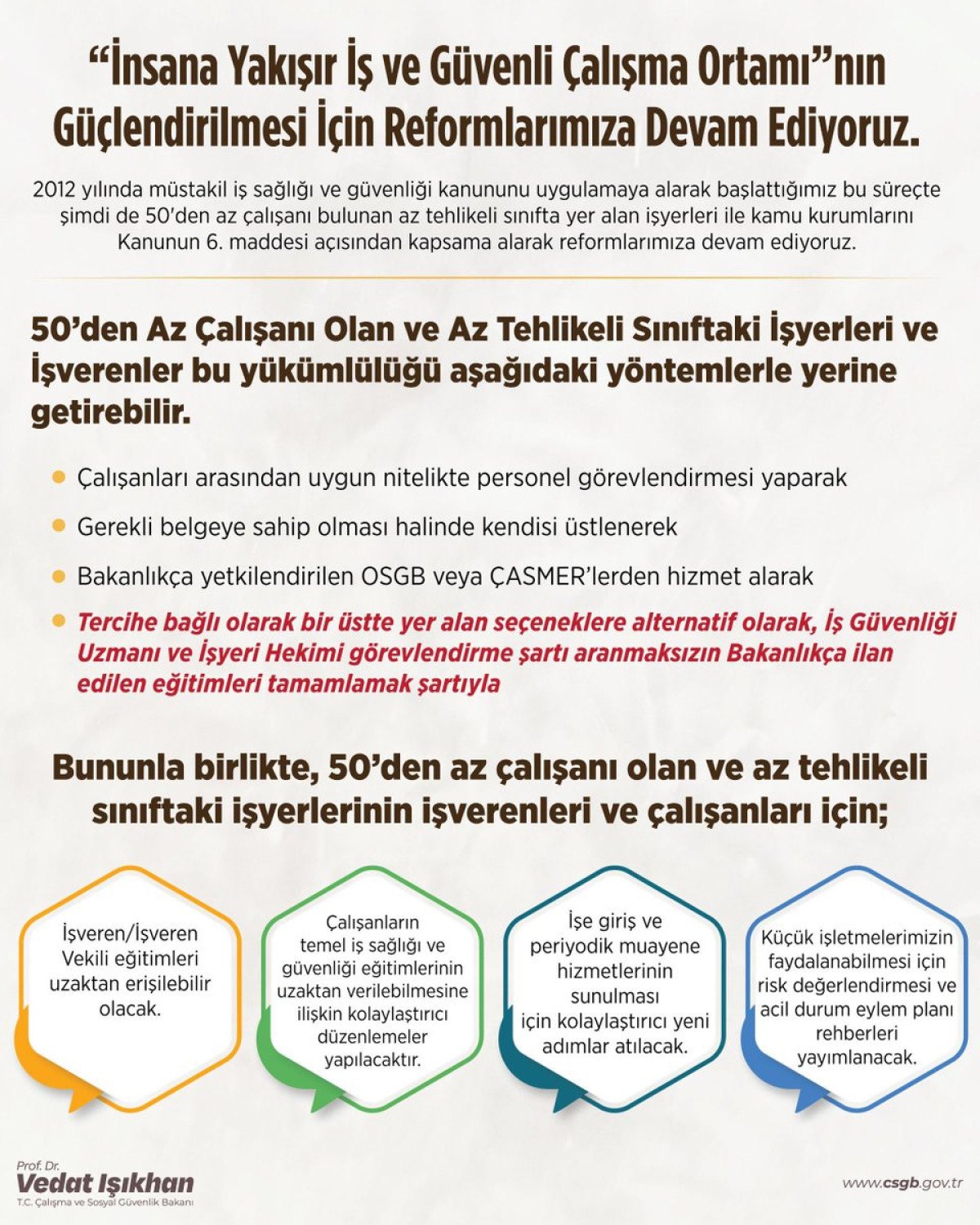 Böylelikle 50’den az çalışanı olan ve az tehlikeli sınıfta yer alan iş yeri işverenleri veya işveren vekili tarafından; çalışanları arasından uygun nitelikte personel görevlendirmesi yaparak, gerekli belgeye sahip olması halinde kendisi üstlenerek, bakanlıkça yetkilendirilen OSGB ve ÇASMER’lerden hizmet alarak veya İş Güvenliği Uzmanı ve İş yeri Hekimi görevlendirme şartı aranmaksızın bakanlıkça ilan edilen eğitimleri tamamlayarak yerine getirebilir.