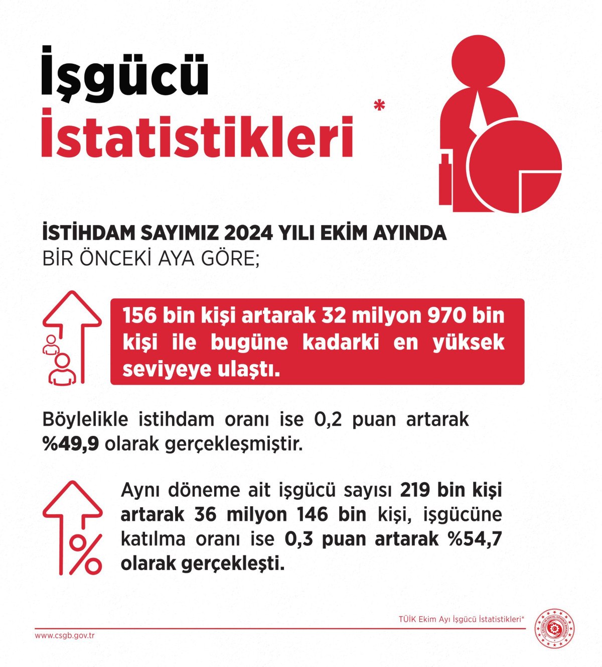 “Orta Vadeli Program hedefleriyle uyumlu şekilde çalışma hayatını güçlendirmeye yönelik attığımız adımlarla ekim ayında istihdam sayımız 156 bin kişi artarak 32 milyon 970 bin kişi, istihdam oranı ise 0,2 puan artarak yüzde 49,9 oldu. Böylelikle istihdam oranında tarihimizin en yüksek seviyesine ulaştık. İşsizlik oranı 0,1 puan artışla yüzde 8,8 oldu. İşsizlik son 18 aydır tekli hanelerde seyrediyor.”