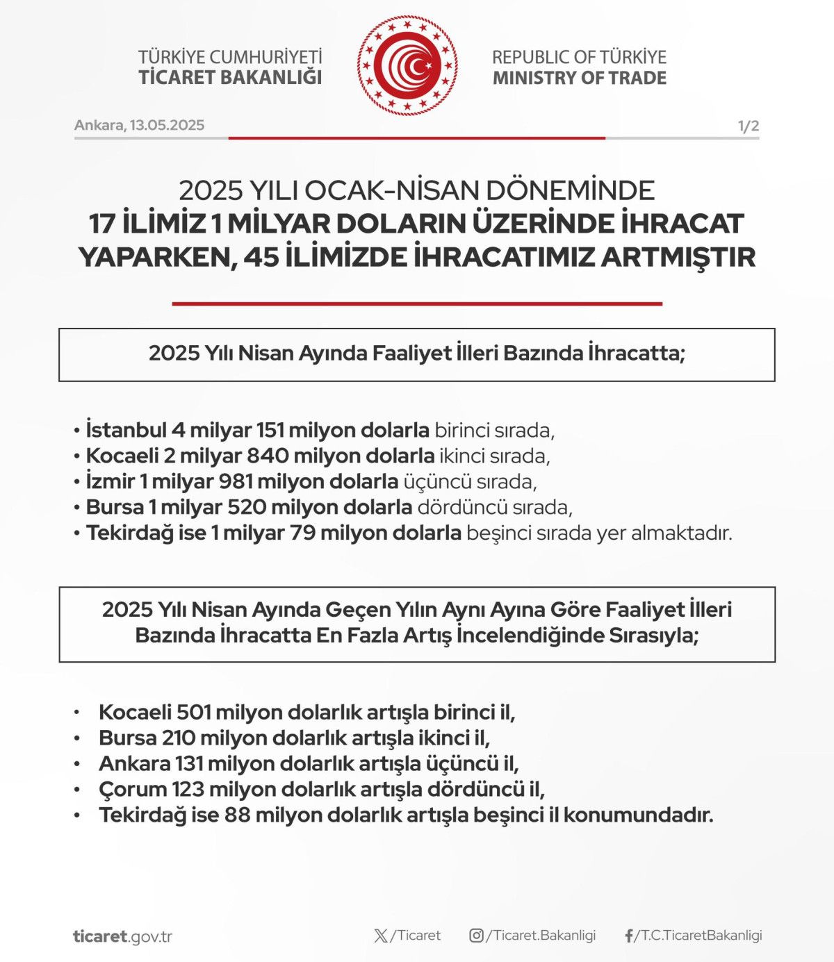 Ticaret Bakanlığı, 2025 yılı Ocak-Nisan periyoduna ait ihracat bilgilerini açıkladı.
