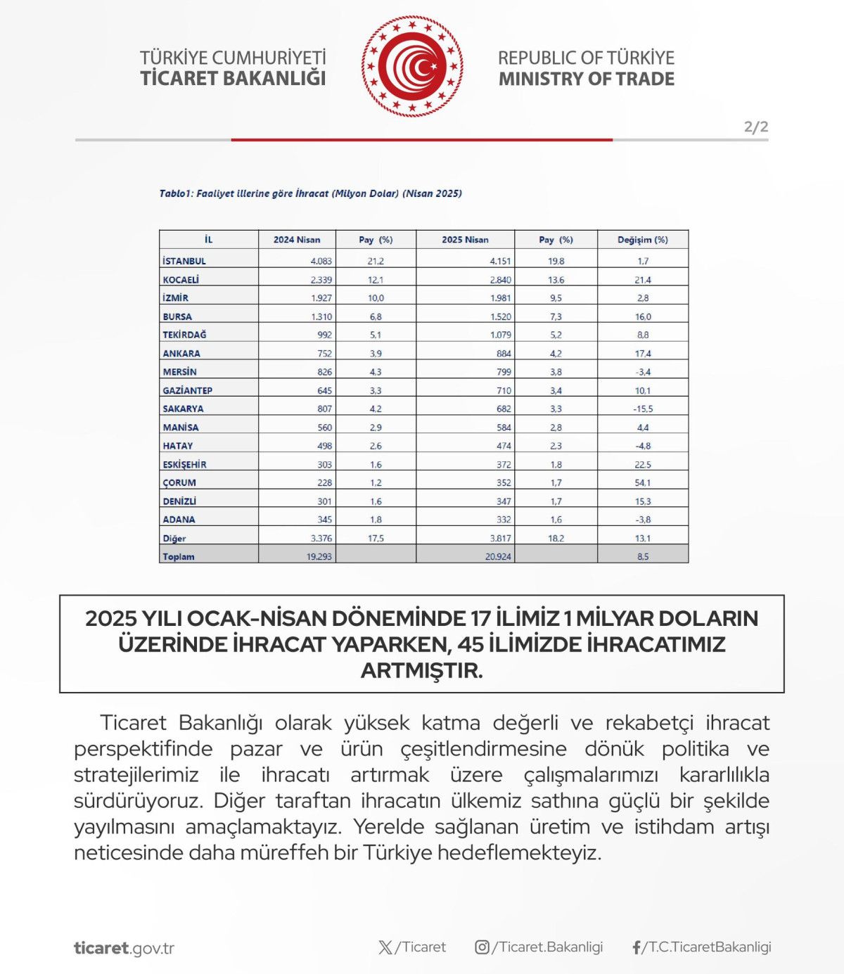 Ticaret Bakanlığı, yüksek katma değerli ve rekabetçi ihracat gayesi doğrultusunda pazar ve eser çeşitlendirme stratejileriyle ihracatı artırmaya yönelik çalışmaların kararlılıkla sürdürüldüğünü belirtti.