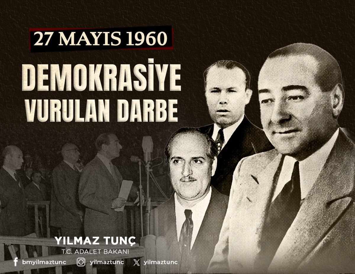 Bakan Tunç, sosyal medya hesabından yaptığı açıklamada, milletin özgür iradesiyle seçtiği hükümetin silah zoruyla misyondan uzaklaştırıldığı 27 Mayıs 1960 darbesinin, Türk demokrasi tarihinin kara lekelerinden biri olduğunu belirtti.