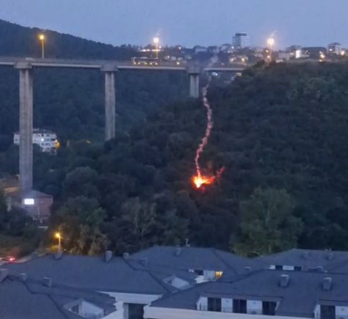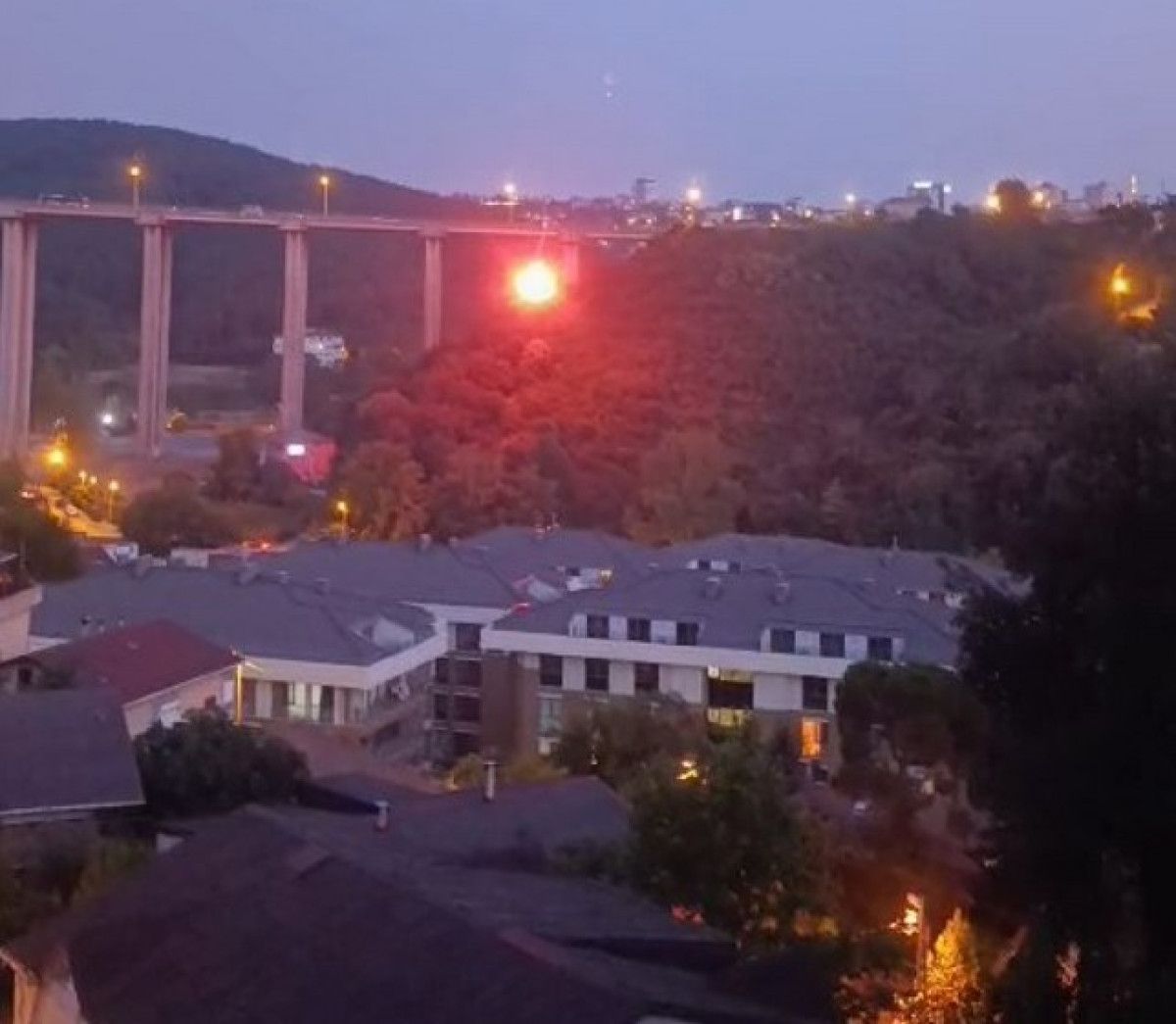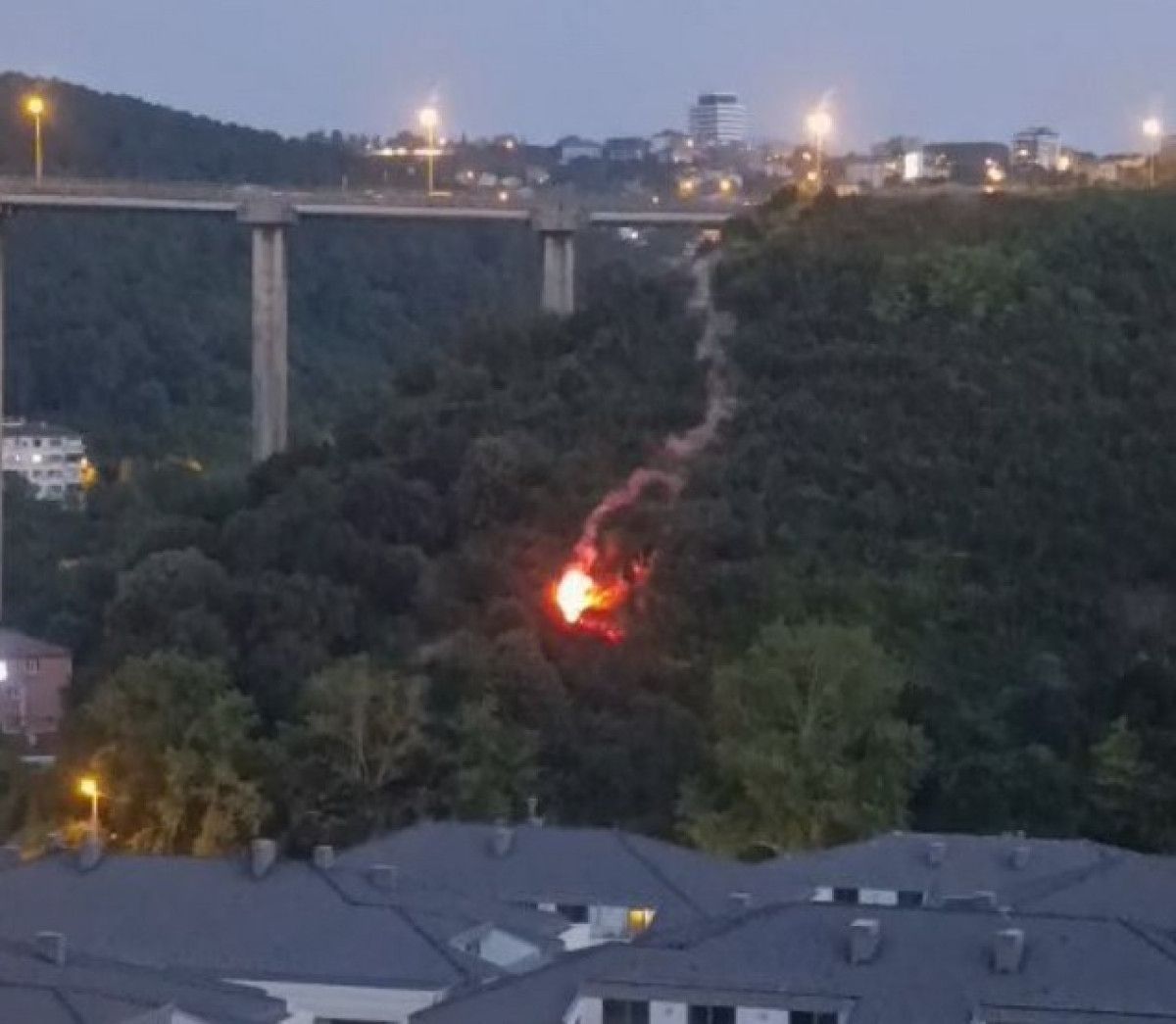 Yangın söndürme çalışmalarının devam ettiği sırada, havadan yanan bir cismin ormanlık alana düştüğü anlar etraftaki vatandaşlar tarafından cep telefonu kameralarıyla kaydedildi.
