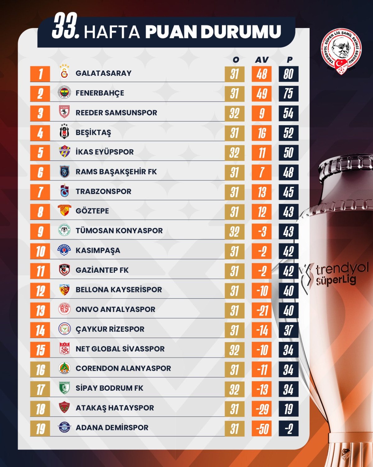Süper Lig’de 33. hafta bugün oynanan tek müsabaka ile tamamlandı.