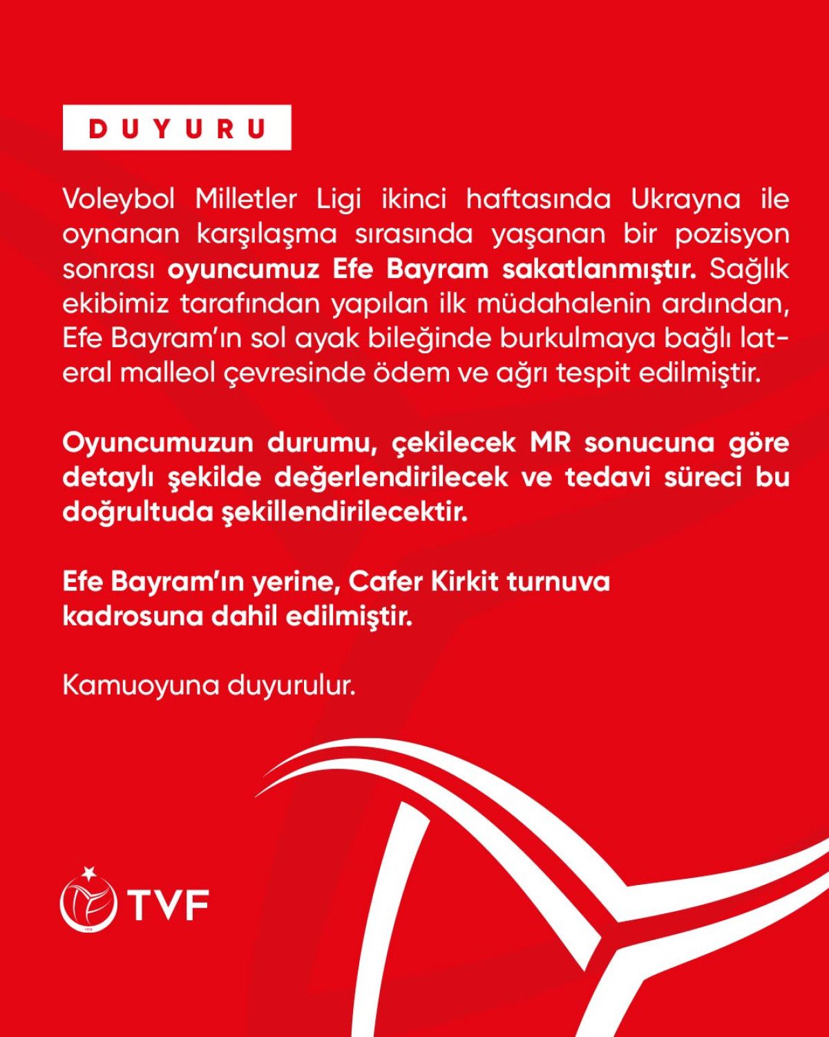 Voleybol Milletler Ligi ikinci haftasında Ukrayna ile oynanan müsabaka sırasında yaşanan bir konum sonrası oyuncumuz Efe Bayram sakatlanmıştır. Sıhhat takımımız tarafından yapılan birinci müdahalenin akabinde, Efe Bayram’ın sol ayak bileğinde burkulmaya bağlı lateral malleol etrafında ödem ve ağrı tespit edilmiştir. Oyuncumuzun durumu, çekilecek MR sonucuna nazaran ayrıntılı biçimde pahalandırılacak ve tedavi süreci bu doğrultuda şekillendirilecektir. Efe Bayram’ın yerine, Cafer Kirkit turnuva takımına dahil edilmiştir.