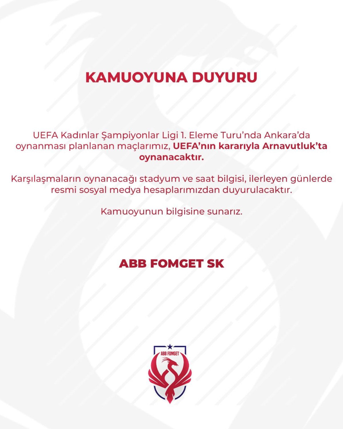 Kulüpten yapılan açıklamada, ABB Fomget’in daha evvel Ankara’da oynanacağı planlanan UEFA Kadınlar Şampiyonlar Ligi 1. Eleme Çeşidi maçlarının UEFA’nın kararıyla Arnavutluk’a alındığı bildirildi.