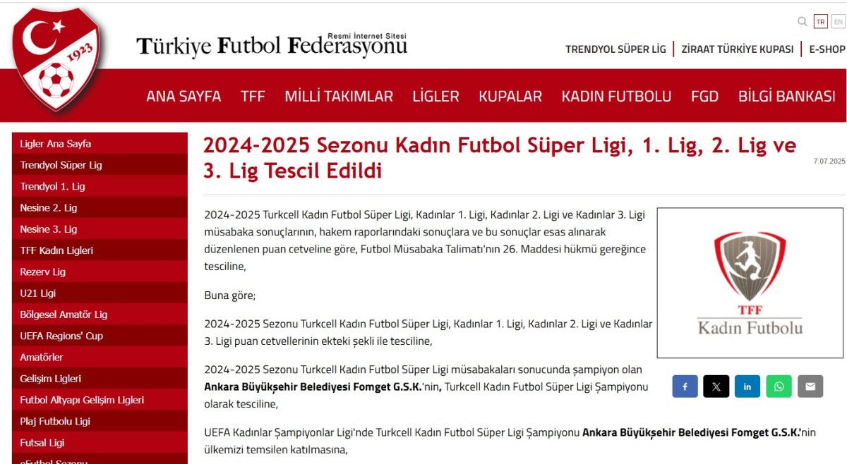 2024-2025 Dönemi Bayan Futbol Süper Ligi, Kadınlar 1. Ligi, Kadınlar 2. Ligi ve Kadınlar 3. Ligi puan cetvellerinin ekteki formu ile tesciline, 2024-2025 Dönemi Turkcell Bayan Futbol Süper Ligi karşılaşmaları sonucunda şampiyon olan Ankara Büyükşehir Belediyesi Fomget G.S.K.’nin, Bayan Futbol Süper Ligi Şampiyonu olarak tesciline, UEFA Bayanlar Şampiyonlar Ligi’nde Bayan Futbol Süper Ligi Şampiyonu Ankara Büyükşehir Belediyesi Fomget G.S.K.’nin ülkemizi temsilen katılmasına, Türkiye Futbol Federasyonu İdare Heyeti’nin 02.07.2025 tarihli toplantısında karar verilmiştir.
