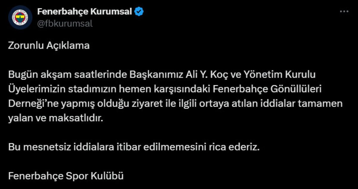 Bugün akşam saatlerinde Liderimiz Ali Y. Koç ve Yönetim Kurulu Üyelerimizin stadımızın çabucak karşısındaki Fenerbahçe Gönüllüleri Derneği’ne yapmış olduğu ziyaret ile ilgili ortaya atılan savlar büsbütün palavra ve niyetlidir. Bu mesnetsiz savlara prestij edilmemesini rica ederiz.