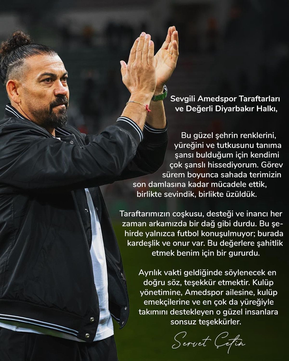Sosyal medya hesabından paylaşım yapan Çetin, “Sevgili Amedspor taraftarları ve bedelli Diyarbakır halkı. Bu hoş kentin renklerini, yüreğini ve tutkusunu tanıma bahtı bulduğum için kendimi çok şanslı hissediyorum. Misyon müddetim boyunca alanda terimizin son damlasına kadar uğraş ettik, birlikte sevindik, birlikte üzüldük. Taraftarlarımızın coşkusu, takviyesi ve inancı her vakit gerimizde bir dağ üzere durdu. Bu kentte sadece futbol konuşulmuyor; burada kardeşlik ve onur var. Bu bedellere şahitlik etmek benim için gururdu. Ayrılık vakti geldiğinde söylenecek en yanlışsız kelam, teşekkür etmektir. Kulüp idaresine, Amedspor ailesine, kulüp işçilerine ve en çok da yüreğiyle kadrosunu destekleyen o hoş insanlara sonsuz teşekkürler” dedi.