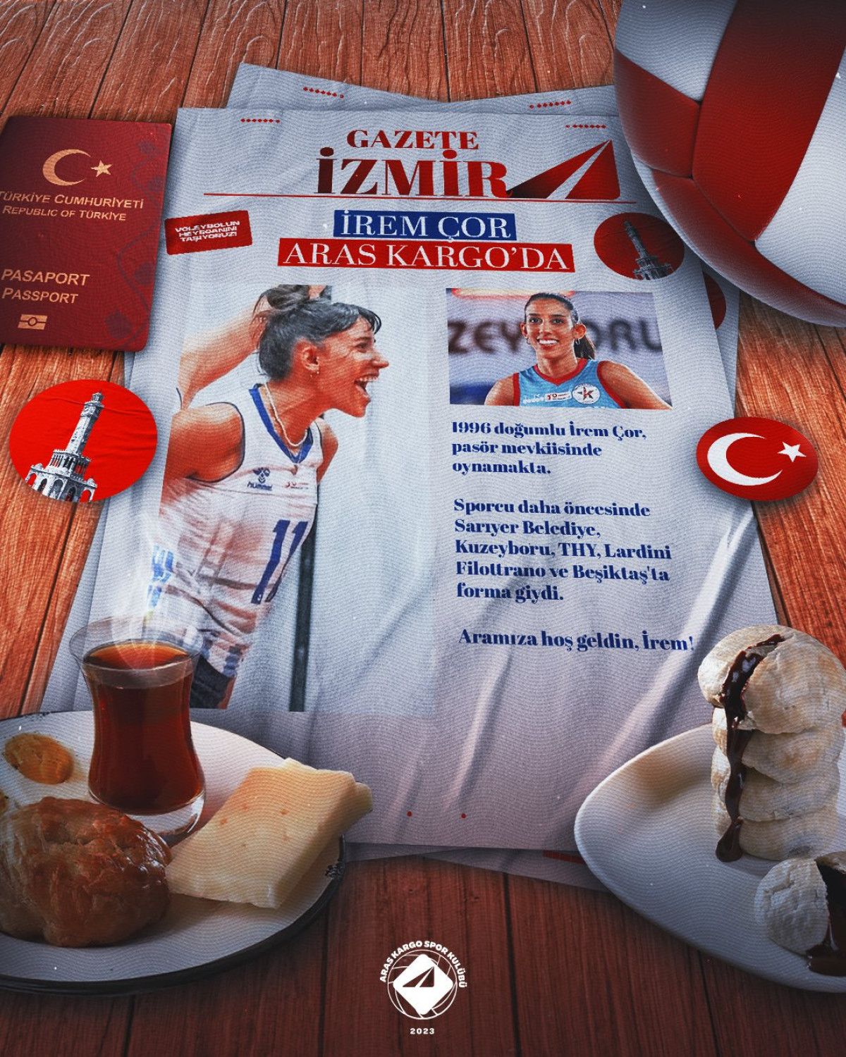 Bu gazetede bir sürü pas var. İzmir’imize güzel geldin. 1996 doğumlu İrem Çor, pasör mevkisinde oynamakta. Atlet daha öncesinde Sarıyer Belediye, Kuzeyboru, THY, Lardini, Filottrano ve Beşiktaş’ta forma giydi. Ortamıza beğenilen geldin İrem.