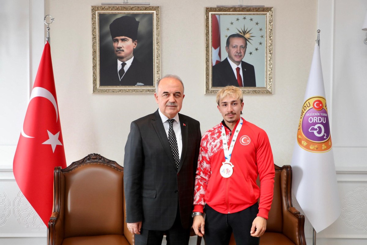 Moldova’da düzenlenen Avrupa Halter Şampiyonası’nda koparmada 154 kilogram ile gümüş, silkmede 194 kilogram ve toplamda 348 kilogram ile Avrupa rekoru kırarak altın madalyaya uzanan milli sporcu Yusuf Fehmi Genç, Ordu Valisi Muammer Erol tarafından makamda kabul edilerek tebrik edildi.