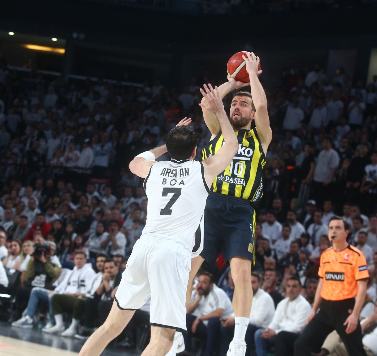Siyah-beyazlı taraftarlar, 16 bin seyirci kapasiteli Sinan Fazilet Spor Salonu’nun büyük çoğunluğunu doldurarak gruplarına takviye verdi.