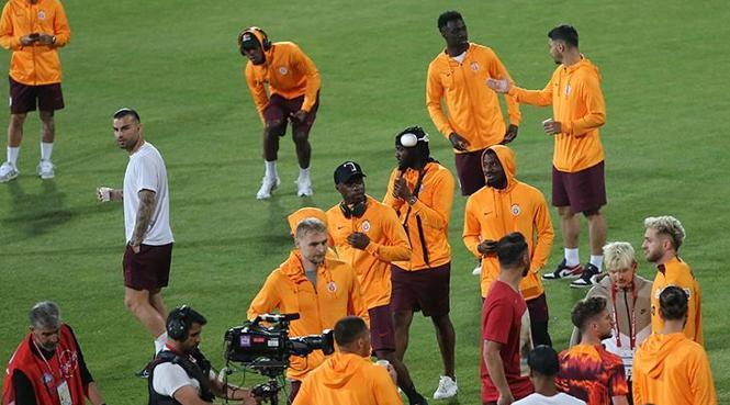 Galatasaraylı futbolcular, karşılaşma öncesi sahaya çıktı ve taraftarlarını selamladı.