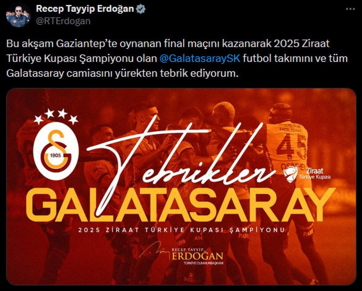 Cumhurbaşkanı Recep Tayyip Erdoğan, toplumsal medya hesabından yayımladığı bildiride, “Bu akşam Gaziantep’te oynanan final maçını kazanarak 2025 Ziraat Türkiye Kupası Şampiyonu olan Galatasaray futbol kadrosunu ve tüm Galatasaray topluluğunu yürekten tebrik ediyorum” dedi.