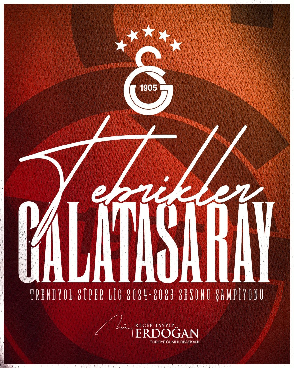 Cumhurbaşkanı Erdoğan toplumsal medya hesabından yayınladığı bildiride, “2024-2025 Süper Lig Şampiyonu olan Galatasaray futbol grubunu, teknik heyetini ve tüm Galatasaray Spor Kulübü topluluğunu yürekten tebrik ediyorum.” tabirlerine yer verdi.