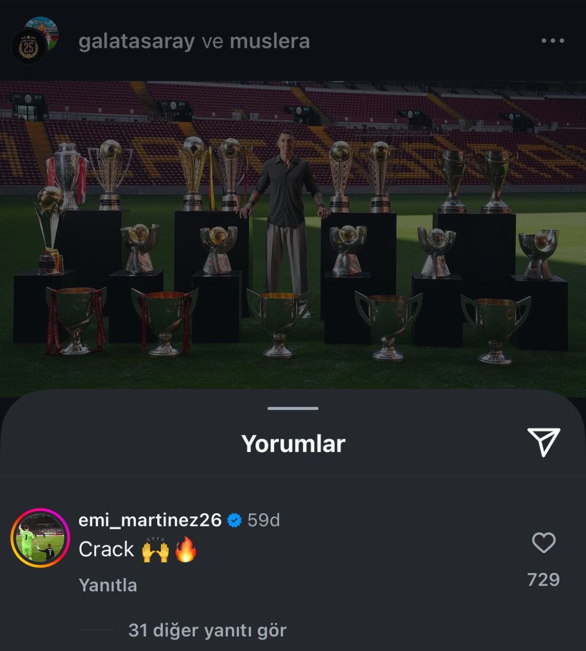 Martinez, Galatasaray’ın Muslera için yaptığı paylaşımlardan birine, “Crack” (Olağanüstü yetenekli) yorumunda bulundu.