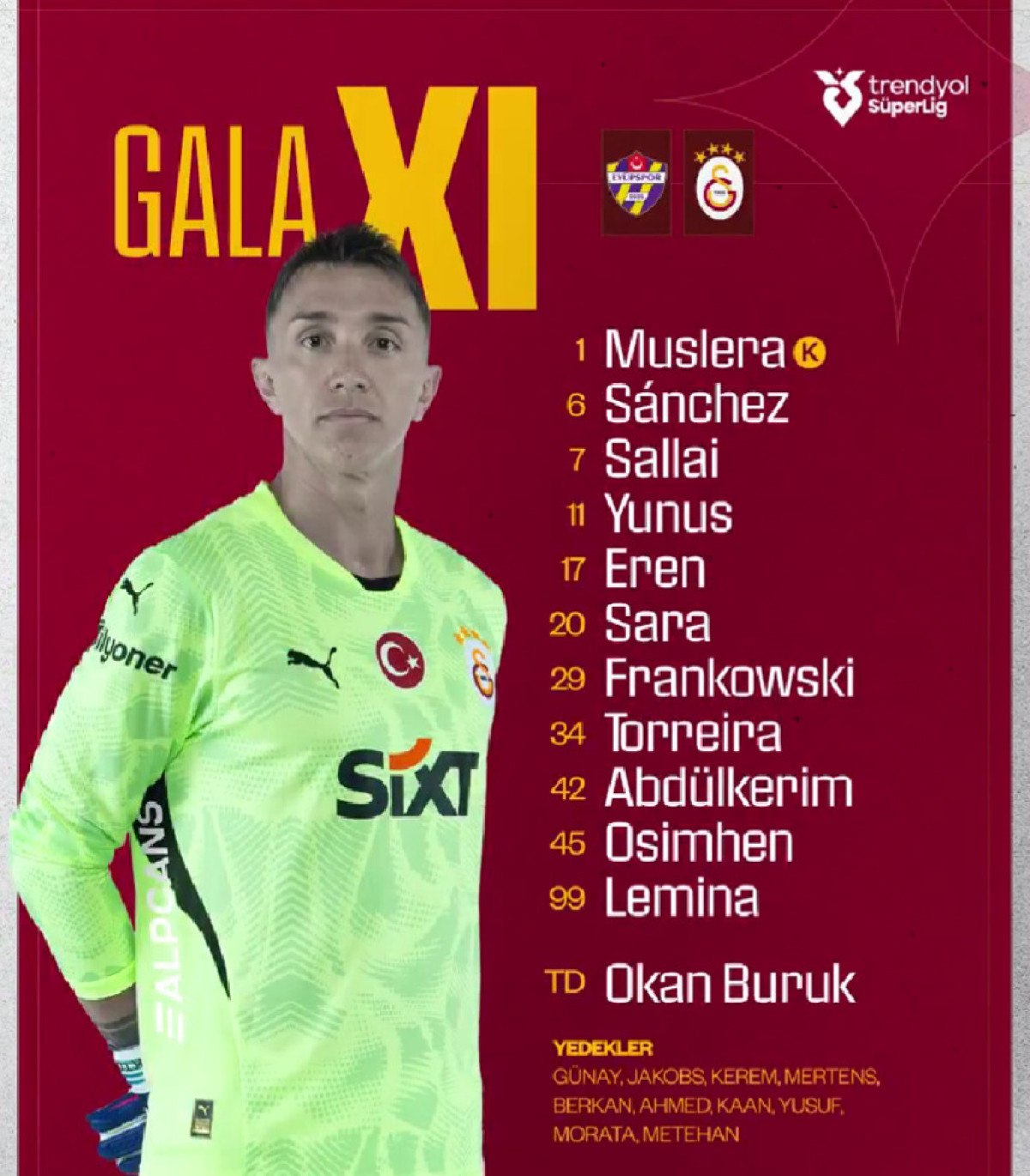 Galatasaray: Muslera, Frankowski, Davinson, Abdülkerim, Eren, Lemina, Torreira, Sara, Sallai, Yunus, Osimhen