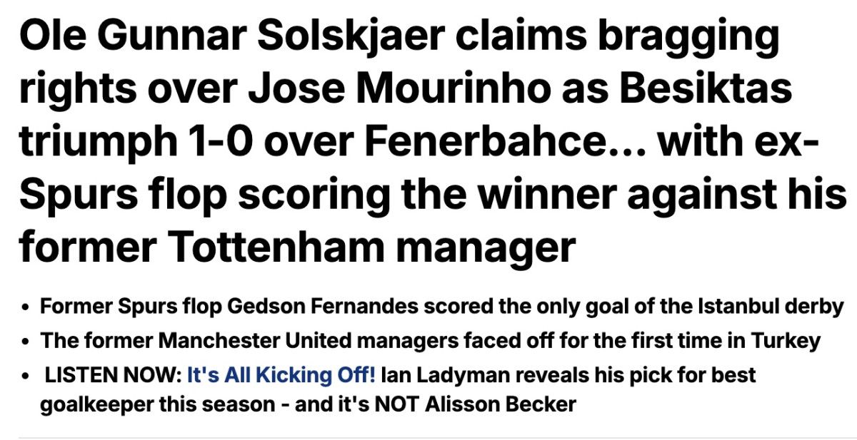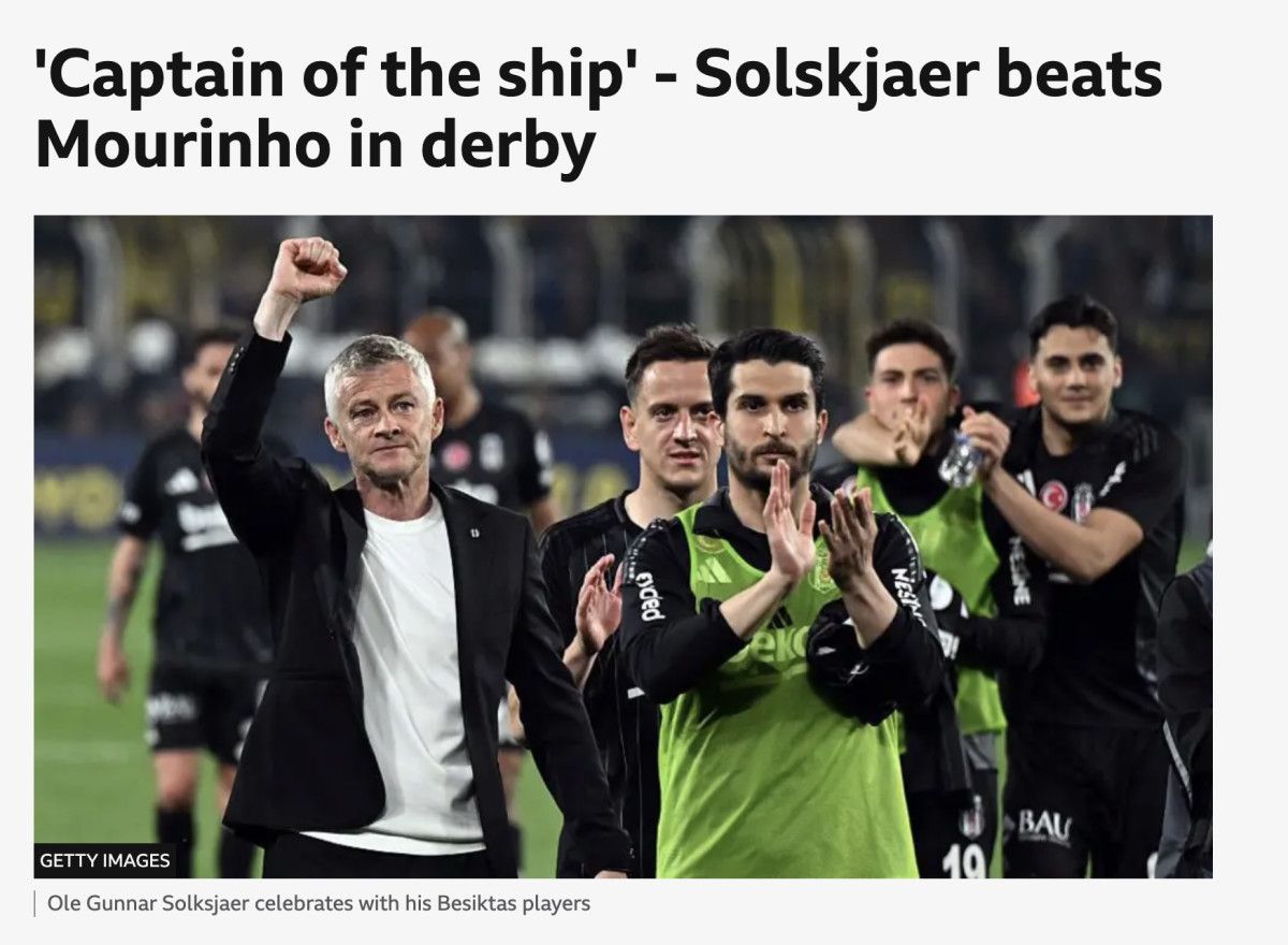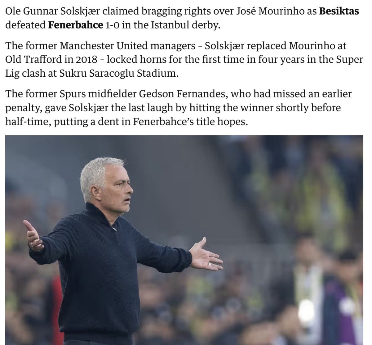“Ole Gunnar Solskjaer’in çalıştırdığı Beşiktaş, İstanbul derbisinde Fenerbahçe’yi 1-0 yenerek Jose Mourinho’nun Muhteşem Lig’i kazanma bahtını azalttı.” sözlerini kullandı.