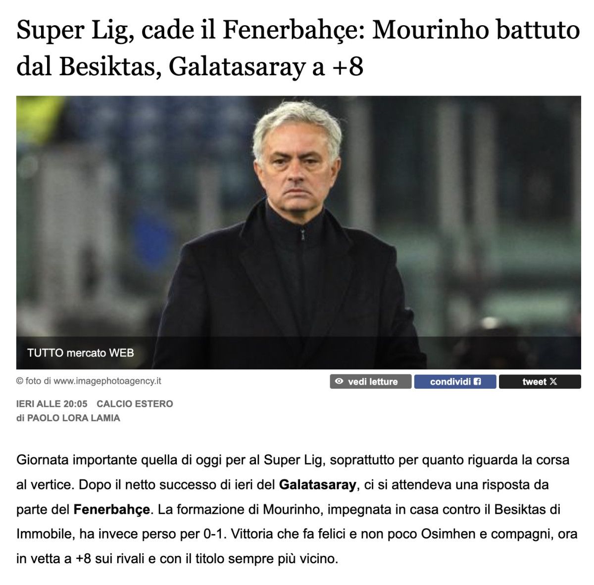 “Bugün Süper Lig’de, bilhassa de tepe yarışında değerli bir gündü. Galatasaray’ın dünkü net muvaffakiyetinin akabinde Fenerbahçe’den bir yanıt bekleniyordu. Bunun yerine, Mourinho’nun kadrosu konutunda Immobile’li Beşiktaş’a karşı 0-1 kaybetti. Bu galibiyet Osimhen ve grup arkadaşlarını sevindirdi, çünkü şu anda dorukta, rakiplerine +8 fark atmış durumdalar ve şampiyonluk her zamankinden daha yakın.”