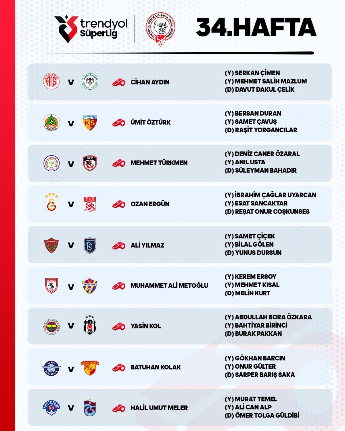 Diğer yandan Galatasaray-Sivasspor gayretinde Ozan Ergün; Kasımpaşa – Trabzonspor müsabakasında ise Halil Umut Meler düdük çalacak.