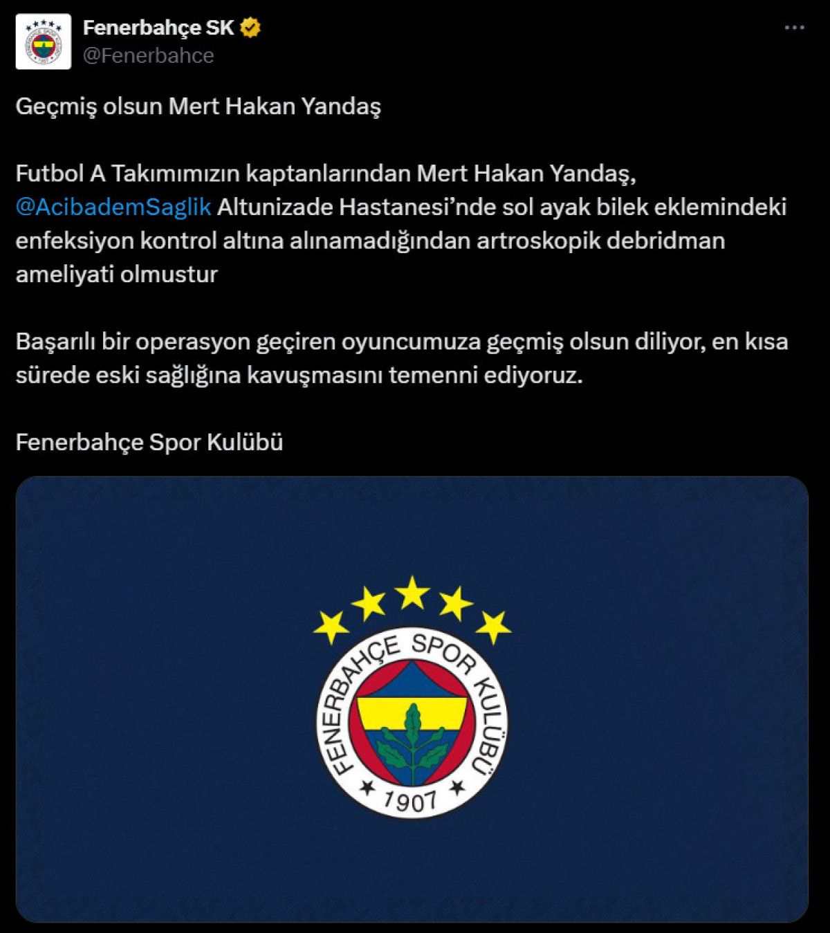 Futbol A Grubumuzun kaptanlarından Mert Hakan Yandaş, sol ayak bilek eklemindeki enfeksiyon denetim altına alınamadığından artroskopik debridman ameliyatı olmuştur.