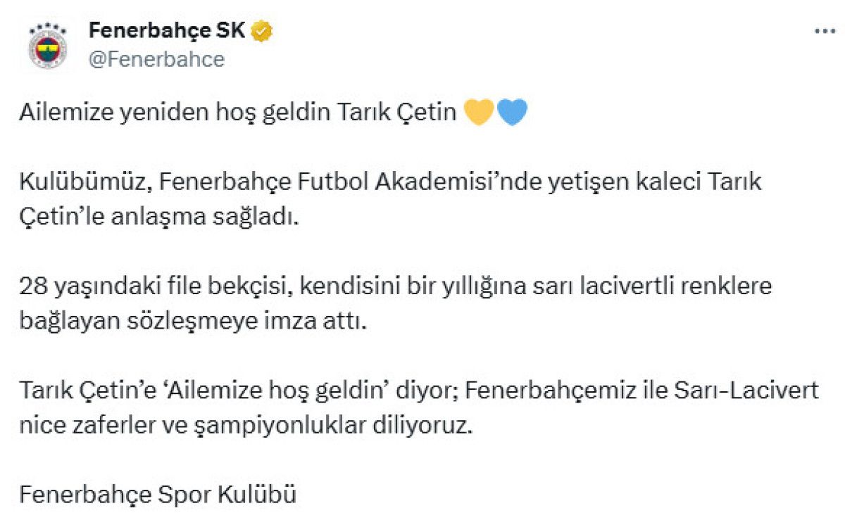 Tarık Çetin’e ‘Ailemize beğenilen geldin’ diyor; Fenerbahçemiz ile Sarı-Lacivert birçok zaferler ve şampiyonluklar diliyoruz.