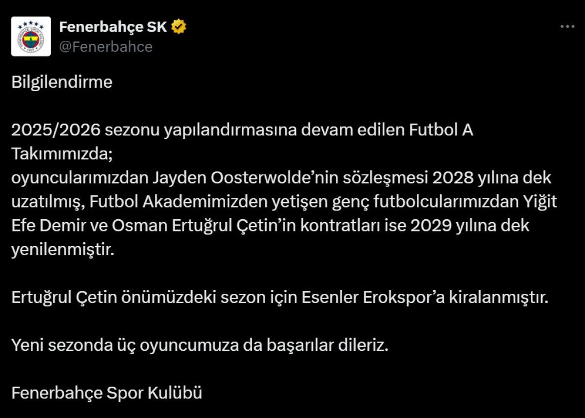 Fenerbahçe, Jayden Oosterwolde, Yiğit Efe Demir ve Ertuğrul Çetin’in mukavelelerinin uzatıldığını ve Ertuğrul’un Erokspor’a kiralandığını açıkladı.