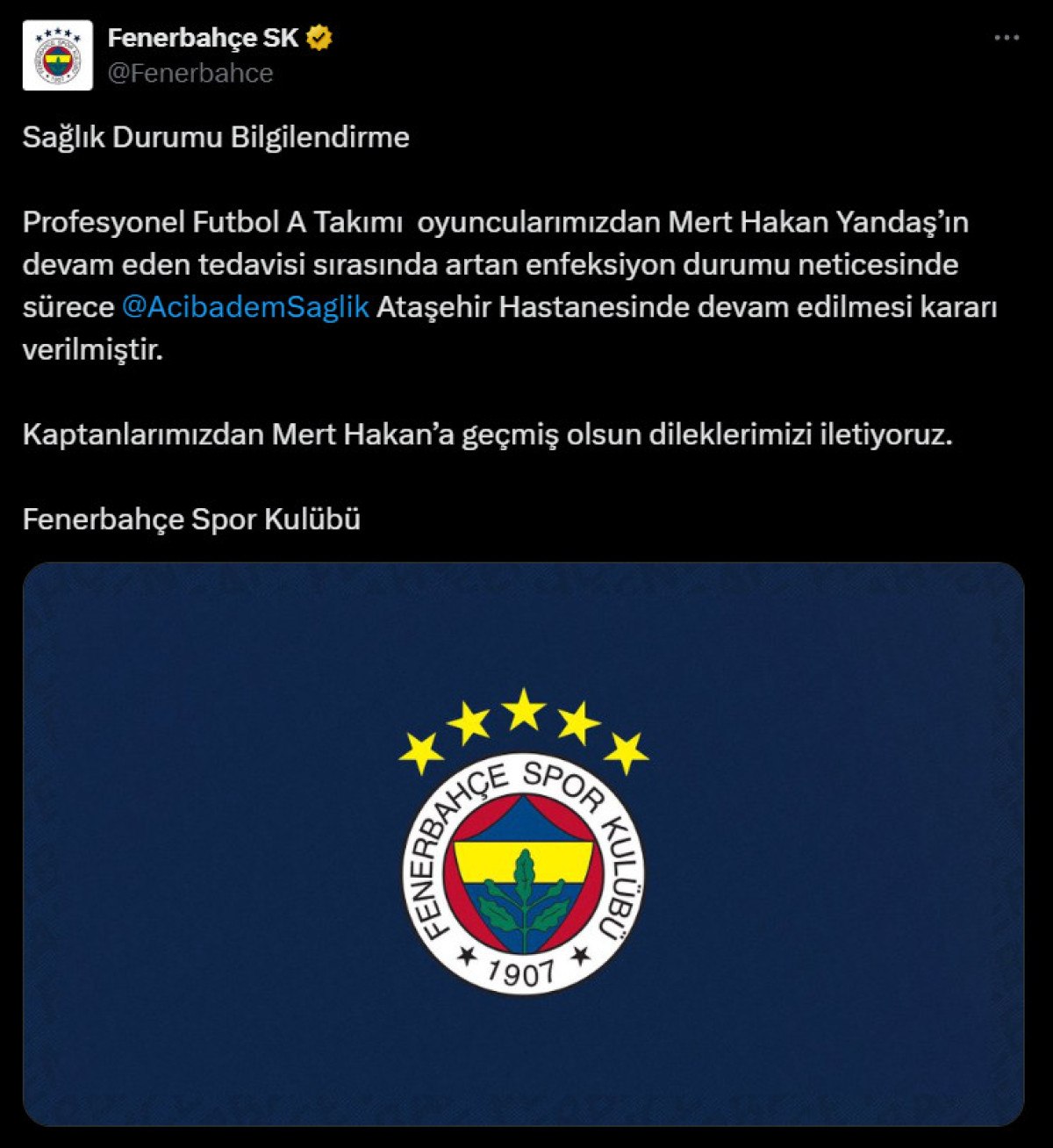 Profesyonel Futbol A Takımı oyuncularımızdan Mert Hakan Yandaş’ın devam eden tedavisi sırasında artan enfeksiyon durumu neticesinde sürece sponsor hastanemizde devam edilmesi kararı verilmiştir.