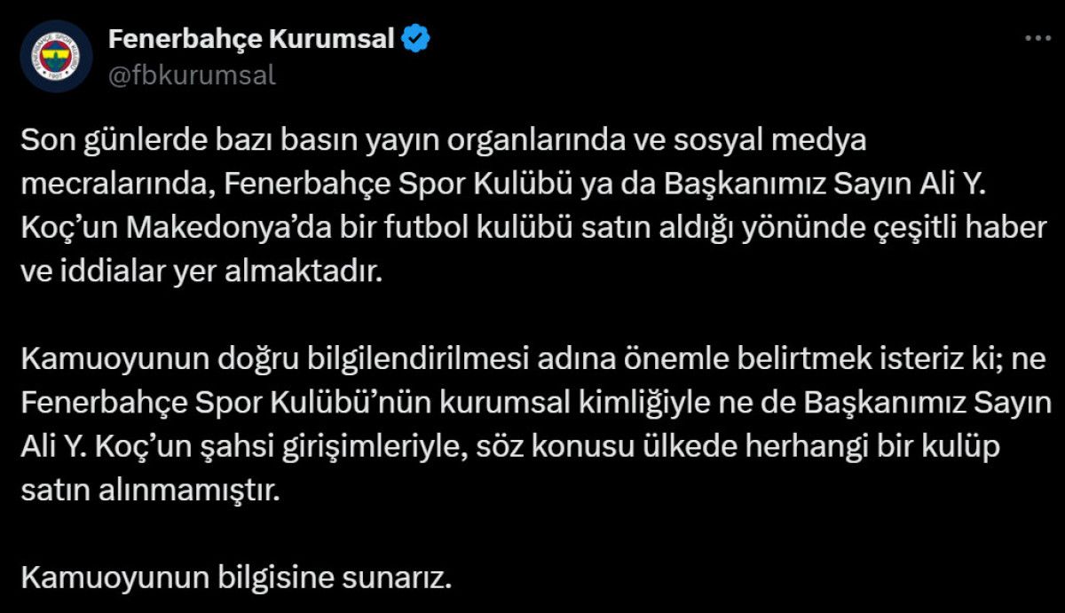 Kamuoyunun hakikat bilgilendirilmesi ismine değerle belirtmek isteriz ki; ne Fenerbahçe Spor Kulübü’nün kurumsal kimliğiyle ne de Liderimiz Sayın Ali Y. Koç’un şahsi teşebbüsleriyle, kelam konusu ülkede rastgele bir kulüp satın alınmamıştır.