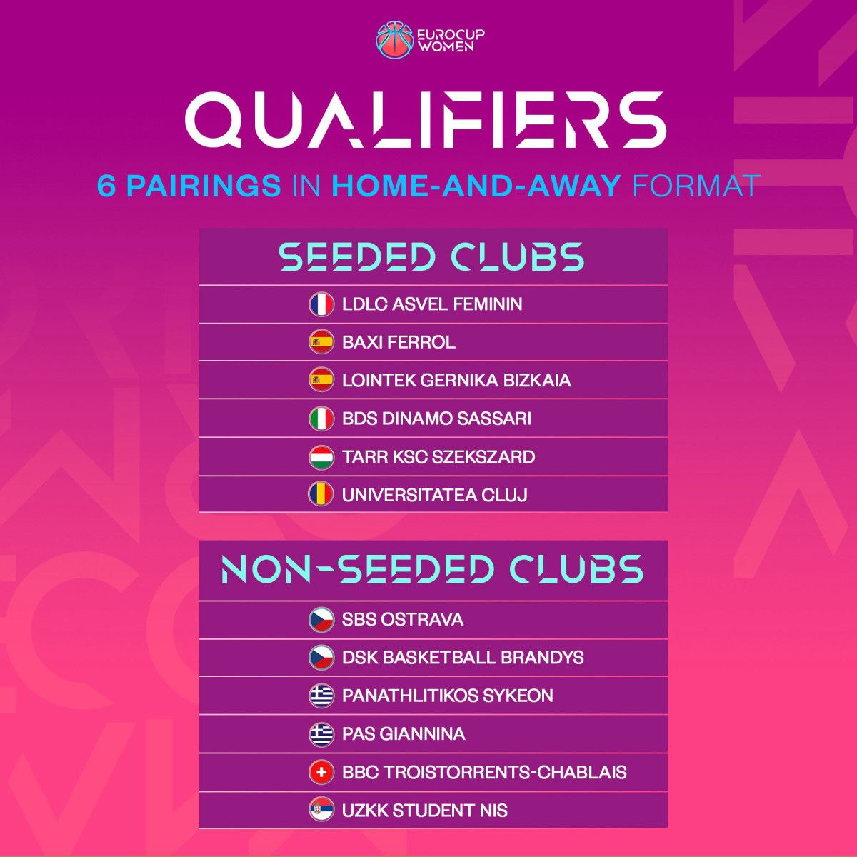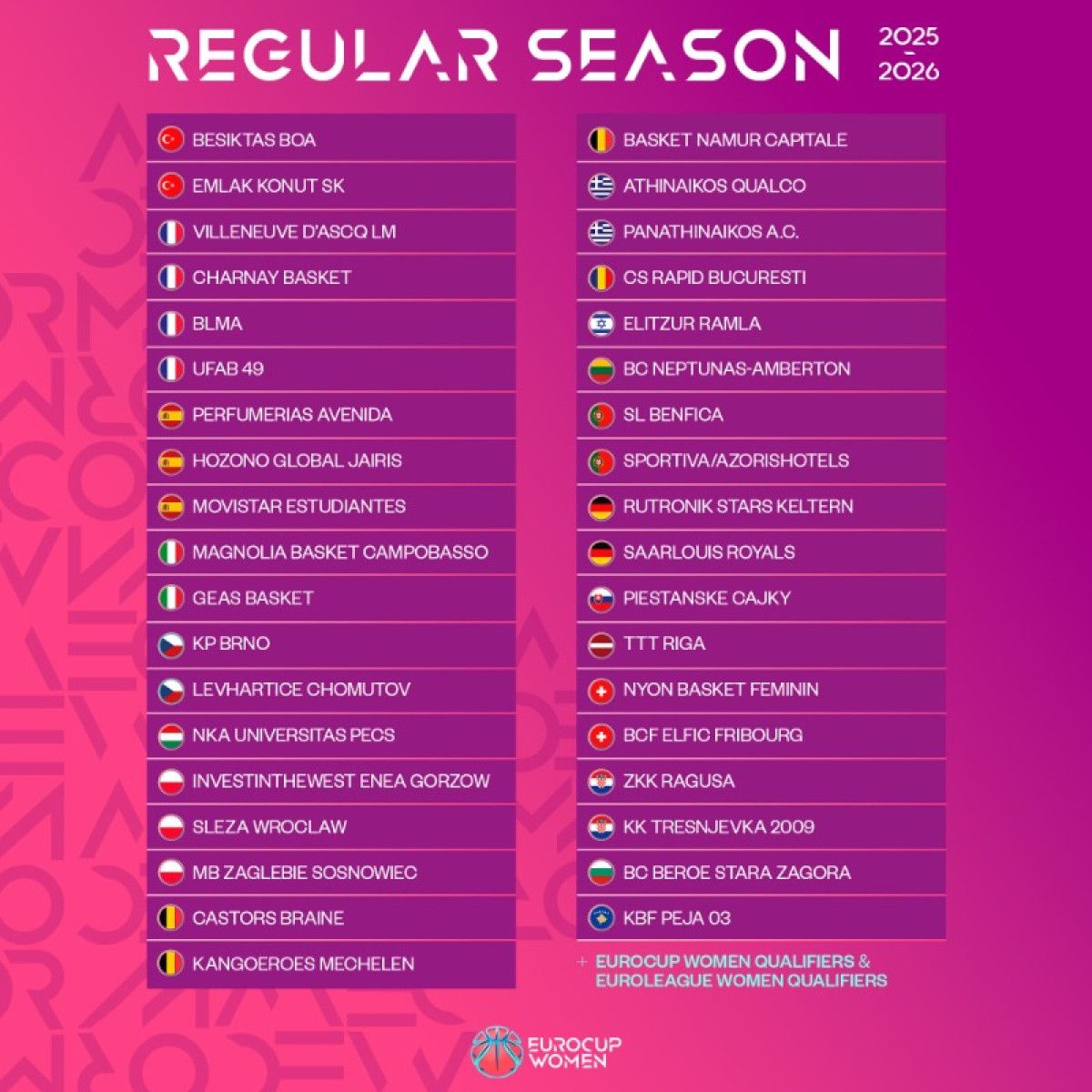 Beşiktaş, Emlak Konut (Türkiye), Villeneuve d’Ascq LM, Charnay Basket, BLMA, UFAB 49 (Fransa), Perfumerias Avenida, Hozono Küresel Jairis, Movistar Estudiantes (İspanya), Magnolia Basket Campobasso, GEAS Basket (İtalya), KP Brno, Levhartice Chomutov (Çekya), NKA Universitas Pecs (Macaristan), InvestInTheWest Enea Gorzow, Sleza Wroclaw, MB Zaglebie Sosnowiec (Polonya), Castors Braine, Kangoeroes Mechelen, Basket Namur Capitale (Belçika), Athinaikos Qualco, Panathinaikos A.C. (Yunanistan), CS Rapid Bucuresti (Romanya), Elitzur Ramla (İsrail), BC Neptunas-Amberton (Litvanya), SL Benfica, Sportiva/AzorisHotels (Portekiz), Rutronik Stars Keltern, Saarlouis Royals (Almanya), Piestanske Cajky (Slovakya), TTT Riga (Letonya), Nyon Basket Feminin, BCF Elfic Fribourg (İsviçre), ZKK Ragusa, KK Tresnjevka 2009 (Hırvatistan), BC Beroe Stara Zagora (Bulgaristan), KBF Peja 03 (Kosova)