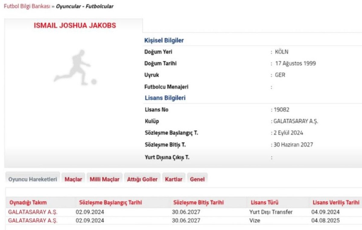 Geçen dönem Galatasaray formasıyla 23 resmi maça çıkan Jakobs, 2 asistlik katkı sağladı.