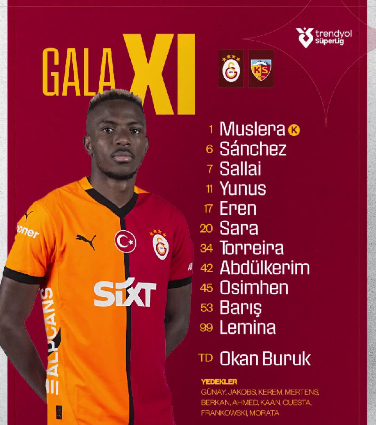 Galatasaray: Muslera, Sallai, Sanchez, Abdülkerim, Eren, Torreira, Lemina, Yunus, Sara, Barış Alper, Osimhen