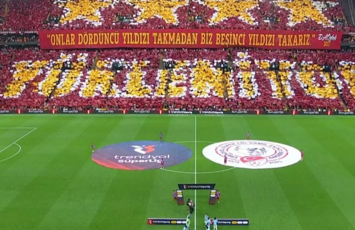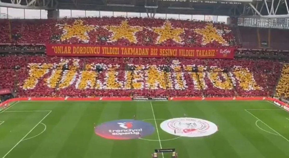Doğu tribününde de sarı-kırmızı kartonlarla ‘İlk ve tek’ yazısı ile ‘5 yıldız’ yapılırken ayrıca Galatasaray Başkanı Dursun Özbek’in 2017 yılında söylediği ‘Onlar dördüncü yıldızı takmadan biz beşinci yıldızı takarız’ kelamının pankartı açıldı.