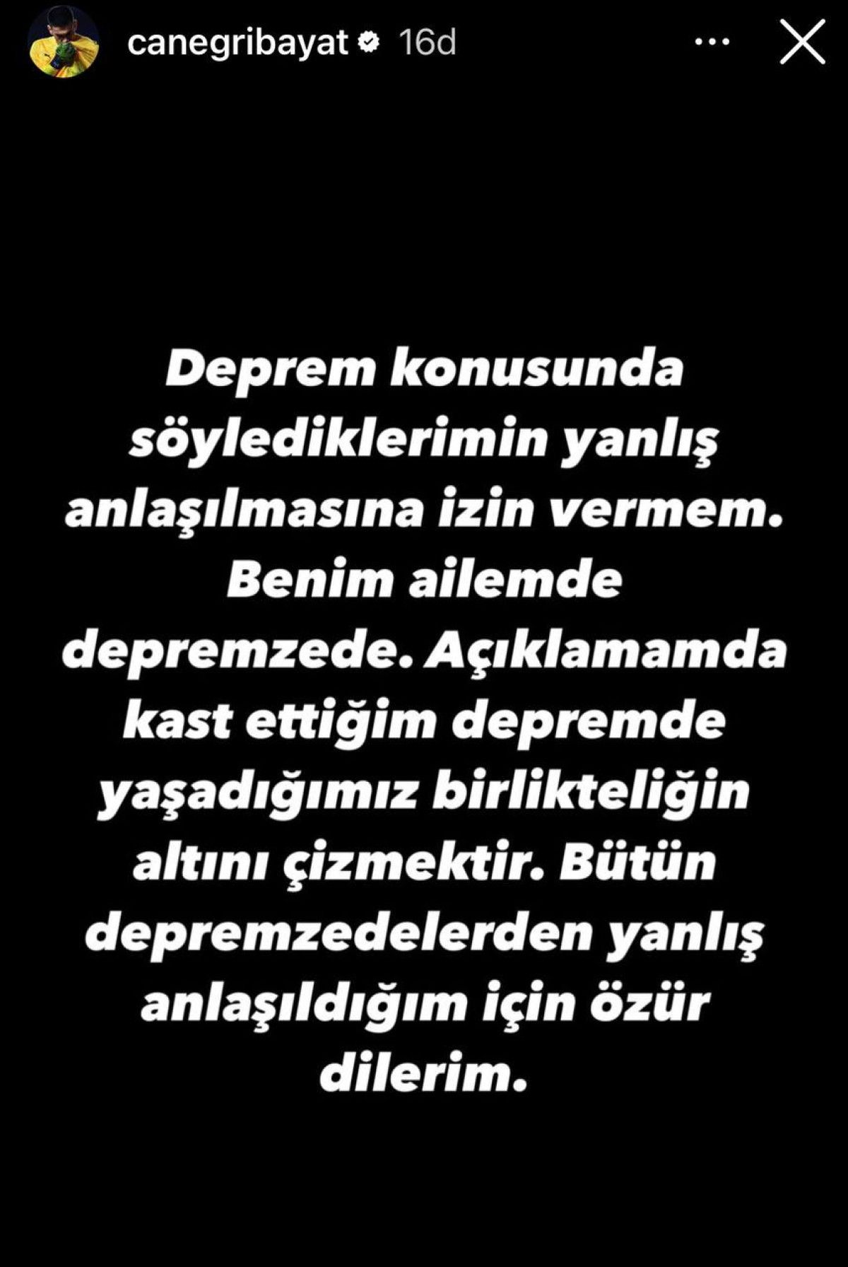 Deprem konusunda söylediklerimin yanlış anlaşılmasına izin vermem. Benim ailem de depremzede. Açıklamamda kastettiğim, depremde yaşadığımız birlikteliğin altını çizmektir. Bütün depremzedelerden yanlış anlaşıldığım için özür dilerim.