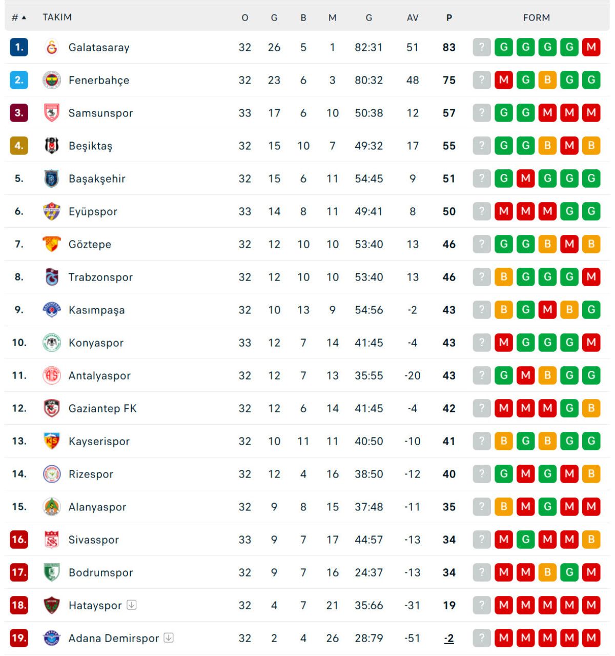 SÜPER LİG’DE PUAN DURUMU
