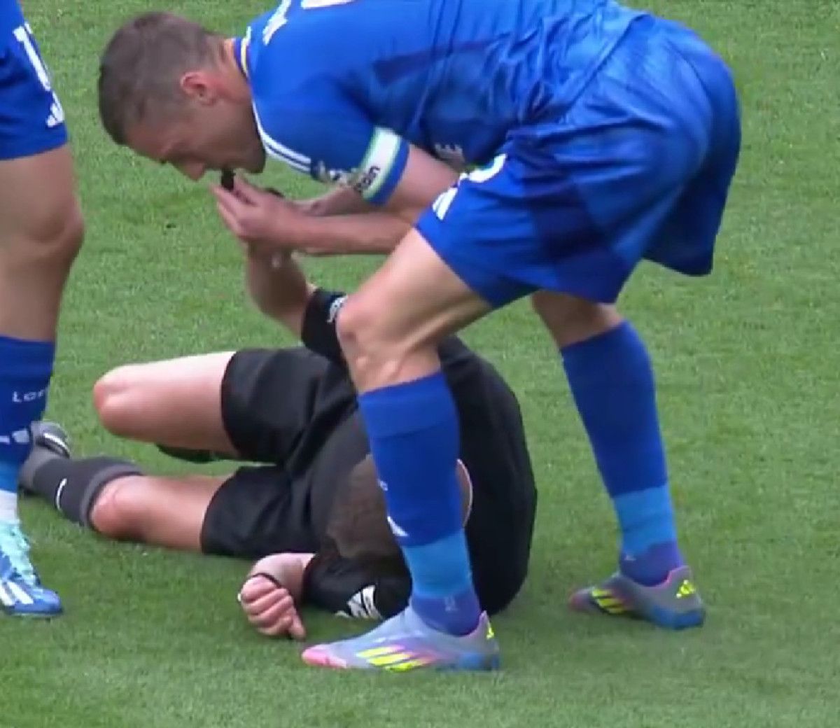 Maç evvel devam ederken oyunun durmayacağını gören Vardy, hakemin yanına gelip düdüğünü aldı ve düdük çalarak maçı durdurdu.